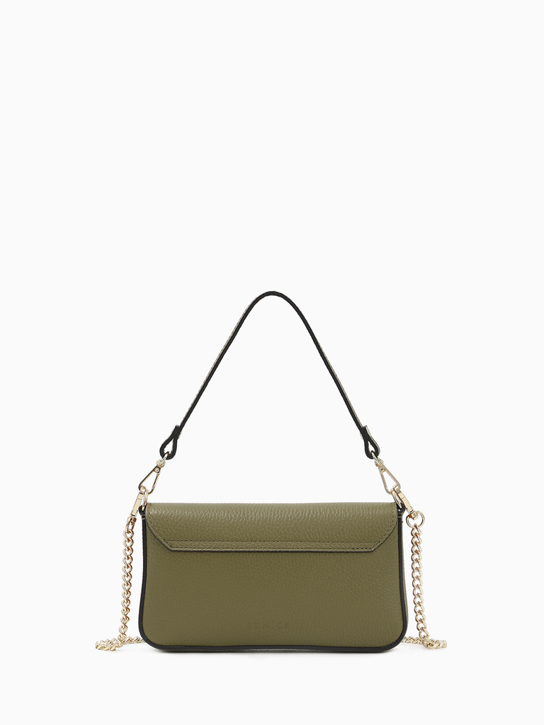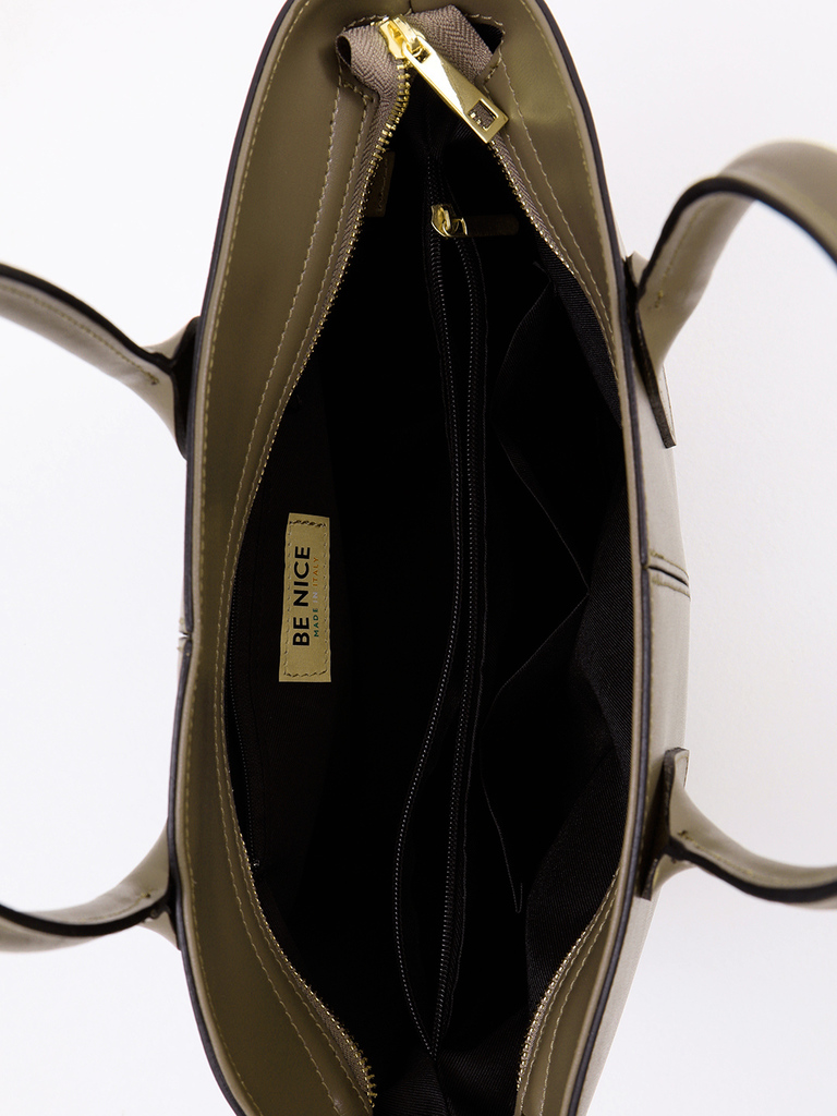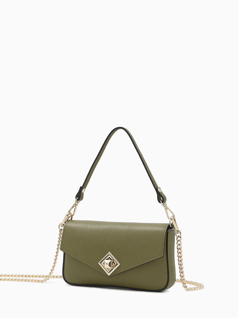 Клатч из натуральной кожи оливкового цвета с золотистой фурнитурой от BE NICE Материал: натуральная кожа Размеры: Длина по дну: 21 см Длина по верхнему краю: 21 см Ширина по дну: 3 см Высота: 12 см (с... Показать описаниебоку) Общая высота с цепочкой: 70 см Описание: Сумка итальянского бренда BE NICE выполнена из натуральной кожи. Данная модель закрывается клапаном на поворотную фурнитуру, носится как клатч, на плече или через плечо на цепочке, максимальная длина которой - 119 см (не регулируется) Внутри: сбоку отделение на молнии для мелочей Производитель: BE NICE, Италия Расположение производства: Италия