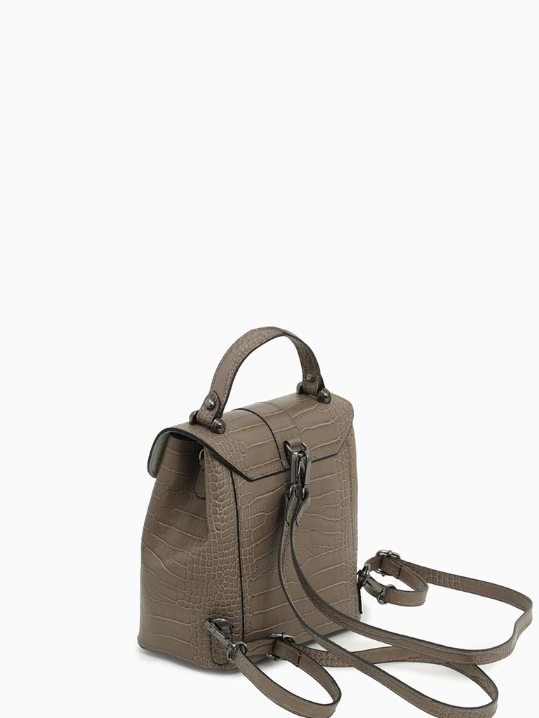 Небольшой рюкзак от BE NICE из натуральной кожи под рептилию цвета тауп Материал: натуральная кожа Размеры: Длина по дну: 20,5 см Длина по верхнему краю: 20 см Ширина по дну: 12,5 см Высота: 21 см Выс... Показать описаниеота с ручкой: 30 см Описание: Классический небольшой рюкзак от итальянского бренда BE NICE выполнен из натуральной кожи с выделкой под крокодила. Рюкзак закрывается клапаном на поворотную фурнитуру. Внутри: сбоку карман на молнии Снаружи: на дне металлические ножки Производитель: BE NICE, Италия Расположение производства: Италия