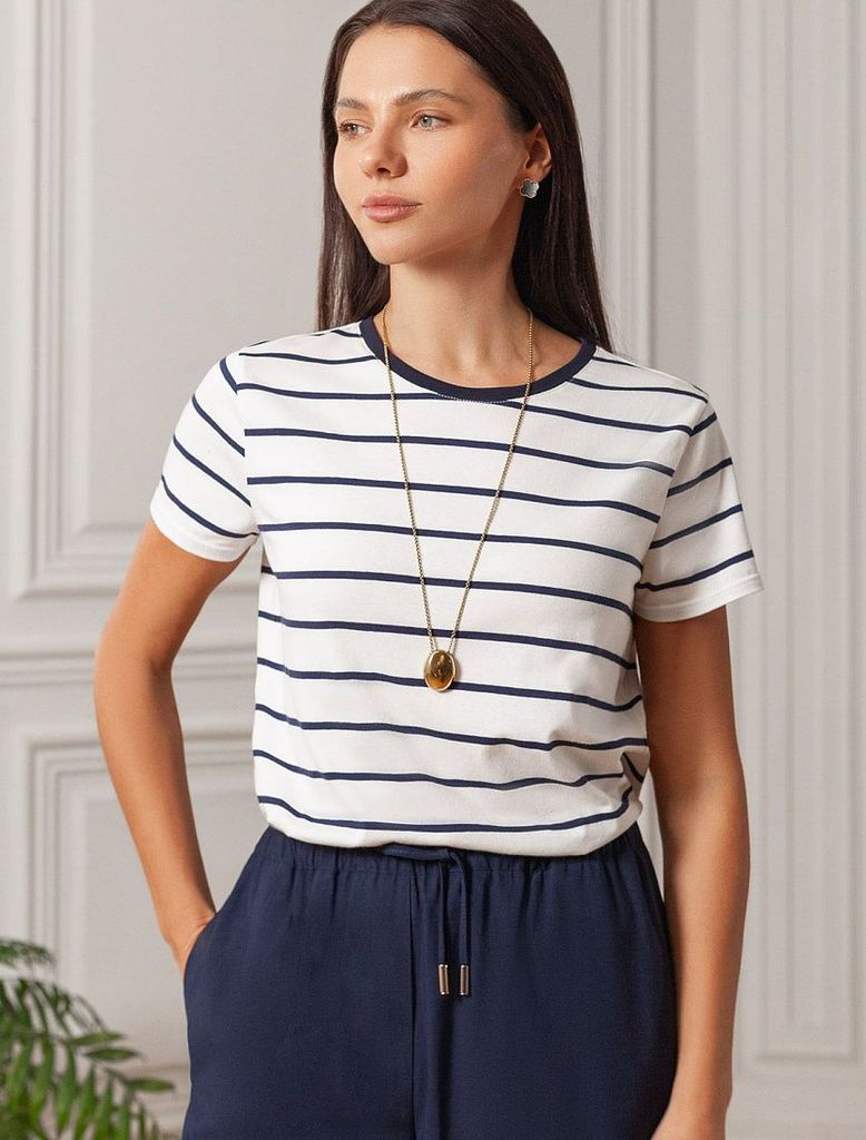 Состав: 92%Хлопок 8%ПУ Плотность: 170 Г/м2 Стильная и модная женская футболка белого цвета в темно-синюю полоску станет отличным дополнением к вашему гардеробу. Футболка плотностью 170 Г/м2 изготовлен... Показать описаниеа из премиального хлопка с добавлением эластана. Добавление эластана в состав изделия способствует формоустойчивости. Эта классическая футболка подходит для создания кэжуал образа на каждый день и идеально подойдет для работы. Модель не мнется, что делает ее практичным вариантом для активных женщин, которые ценят стиль и удобство. Благодаря современному принту полоска эта футболка легко комбинируется с различными элементами гардероба. Она станет универсальным решением для тех, кто предпочитает комфортный стиль casual. Повседневная футболка подчеркнет вашу индивидуальность и позволит вам выглядеть привлекательно в любой ситуации. Легкость в уходе и высокая износостойкость делают ее незаменимой вещью в вашем гардеробе. Одевайте эту модель как на работу, так и на встречу с друзьями — она всегда будет уместна! Стильная и практичная модель с простым кроем и лаконичным дизайном - идеальный вариант для тех, кто ценит качество, минимализм и классический стиль в одежде.