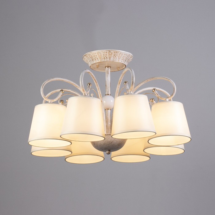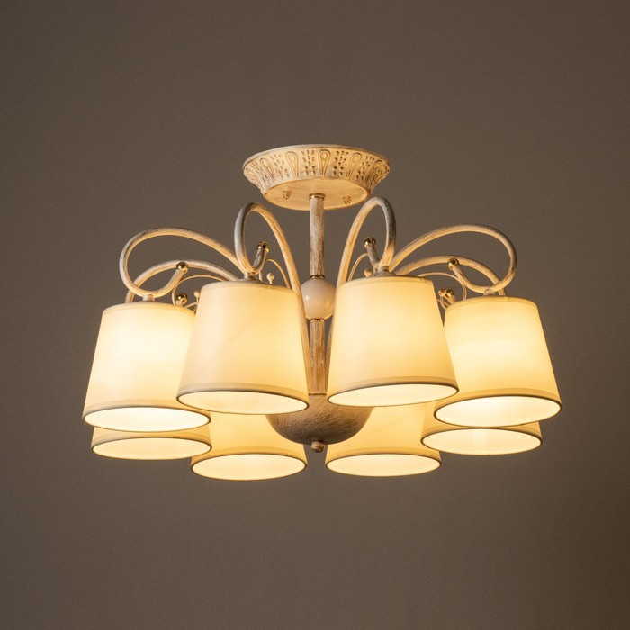 Свет, обрамлённый в белоснежный текстиль и золото. Потолочная люстра с восемью конусными абажурами и патиной под старину — изящное решение для освещения гостиной, спальни, кухни или прихожей до 16 м?.... Показать описание Белый металлический каркас с элементами золотистой патины и мягкие тканевые рассеиватели создают атмосферу классического домашнего уюта с лёгким налётом роскоши. * Восемь патронов E14, до 40 Вт каждая: Совместима с лампами накаливания, но рекомендуется использовать светодиодные — они не перегреваются, экономичны и подходят для натяжных потолков. * Белые текстильные абажуры, свет направлен вниз: Обеспечивают мягкое, сфокусированное освещение без резких теней. Ткань рассеивает свет, делая его комфортным для глаз даже при длительном пребывании в комнате. * Размер 79?79 см — масштаб с достоинством: Светильник заметен, но не перегружает интерьер. Удачно смотрится в просторных комнатах с высотой потолков от 2,5 м, особенно над обеденной зоной или в центре холла. * Металлическое основание и крепление на планку: Прочная конструкция обеспечивает надёжность. Отделка с золотистой патиной придаёт благородства, не теряя аккуратности — подходит как для классики, так и для современных интерьеров с элементами винтажа. Когда выбирать эту модель: Если вы хотите добавить интерьеру тепла через свет и текстуру. Текстильные абажуры смягчают атмосферу, золотистые акценты — придают законченности. Управление — через общий выключатель: никаких лишних деталей, только форма, материал и свет. Эта люстра — выбор для тех, кто ценит элегантную простоту, где каждый элемент говорит о вкусе, а не о показной роскоши.