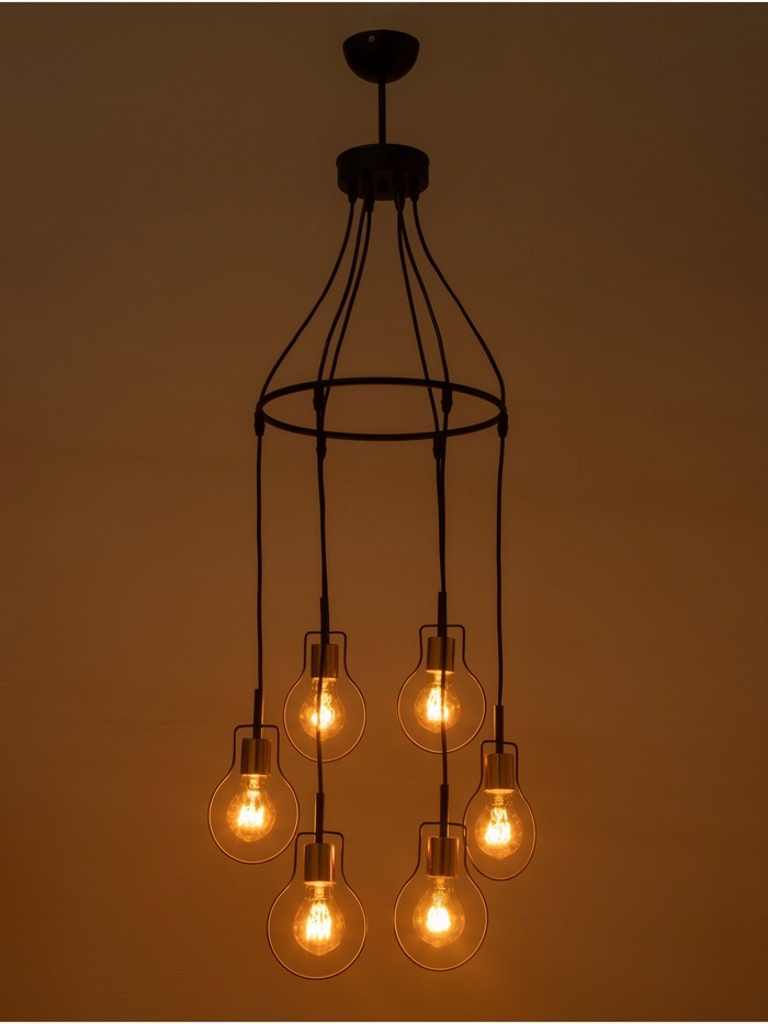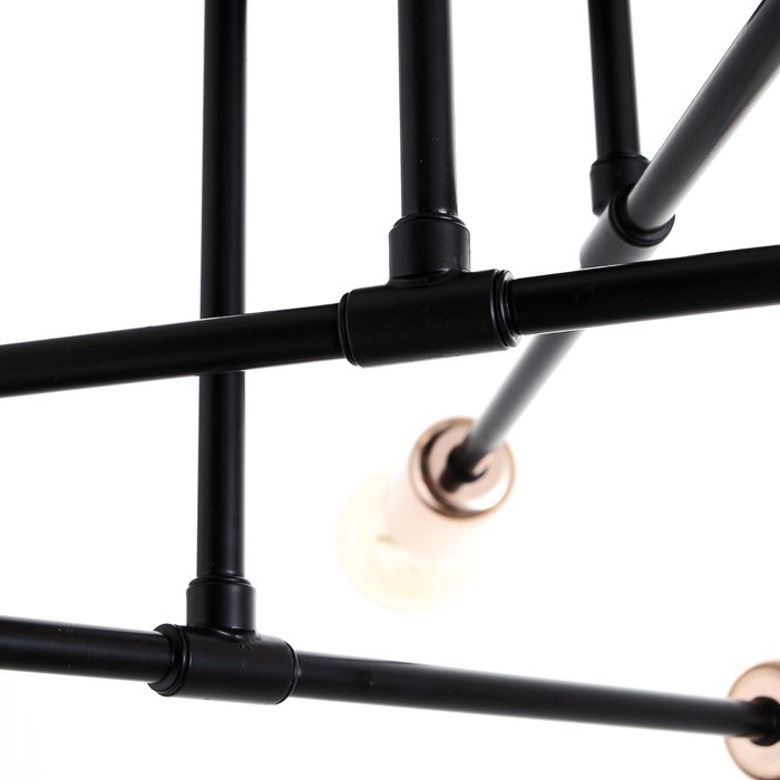 Свет, собранный в чёрно-бронзовой сетке. Подвесной светильник 61 см с шестью лампами E27 и металлическим каркасом — выразительное решение для гостиной, офиса или интерьеров кафе и ресторанов до 12 м?.... Показать описание Шестиламповая композиция на штанге, сочетание чёрного и бронзового оттенков создают атмосферу современного лофта с элементами минимализма. * Шесть патронов E27, до 40 Вт каждая: Совместимы с лампами накаливания, но рекомендуется использовать светодиодные — они не перегреваются, безопасны для натяжных потолков и служат дольше. Лампы с эффектом «голый нить» усиливают визуальную глубину и добавляют характера композиции. * Чёрные металлические рассеиватели, свет в стороны: Основной объём света охватывает периферию помещения, равномерно засвечивая стены и боковые зоны. Это создаёт ощущение открытости и визуально расширяет пространство. * Квадратная форма 61?61 см — масштаб без тяжести: Светильник заметен, но не перегружает интерьер. Удачно располагается над обеденной зоной, в центре комнаты или в общественной зоне с высокими потолками. * Металлическое основание и крепление на планку: Прочная конструкция обеспечивает устойчивость. Контраст чёрного и бронзового цветов придаёт светильнику благородства, не теряя строгости — подходит для индустриальных и современных интерьеров. Когда выбирать эту модель: Если вы создаёте интерьер, где важны графичность, ритм и игра контрастов. Эта люстра не требует пульта — управление через общий выключатель делает её практичной и надёжной. Она не просто светит, а формирует пространство: выбор для тех, кто ценит архитектурность, баланс холодного и тёплого, и освещение, которое работает как часть дизайна, а не фон.