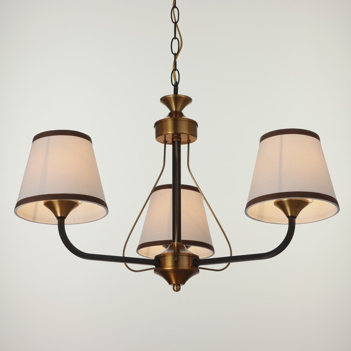 Свет, оправленный в бронзу и тень. Подвесная люстра с тремя белыми текстильными абажурами и черно-бронзовым каркасом — выразительное решение для гостиной, спальни, кухни или прихожей до 6 м?. Её класс... Показать описаниеический силуэт, цепной подвес и контраст цветов создают атмосферу благородной классики с оттенком индустриальной строгости. * Три патрона E27, до 40 Вт каждая: Совместима с лампами накаливания, но рекомендуется использовать светодиодные — они не перегреваются, безопасны для натяжных потолков и служат дольше. Лампы с эффектом «голый нить» усиливают винтажный характер светильника. * Белые текстильные абажуры, свет направлен вверх: Основной объём света отражается от потолка, создавая мягкое фоновое сияние. Ткань рассеивает лучи, исключает резкие тени и добавляет комнате тепла. * Цепной подвес, регулируемая высота (14–28 см): Возможность адаптировать положение люстры под разные типы потолков. Удачно смотрится как в помещениях с высокими, так и со стандартными перекрытиями. * Металлическое основание в цвете чёрная бронза и крепление под крюк: Глубокий, благородный оттенок сочетается с тёмными стенами, деревянным полом и антикварной мебелью. Металл устойчив к окислению, сохраняет внешний вид со временем. Когда выбирать эту модель: Если вы создаёте интерьер в стиле классика, где важны симметрия, глубина цвета и мягкое освещение. Эта люстра не требует пульта: управление через общий выключатель делает её практичной и долговечной. Она работает как завершающий акцент — выбор для тех, кто ценит контраст материалов, достоинство формы и свет, который не просто освещает, а формирует настроение пространства.