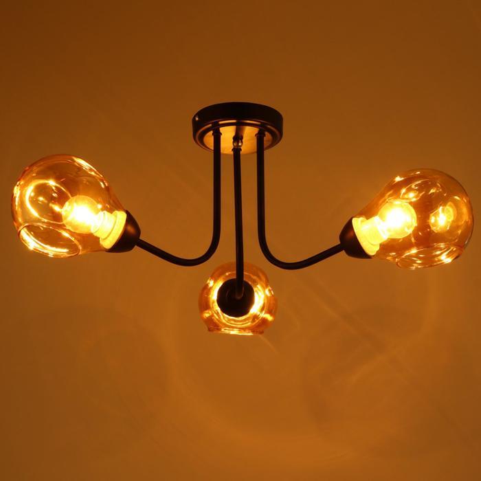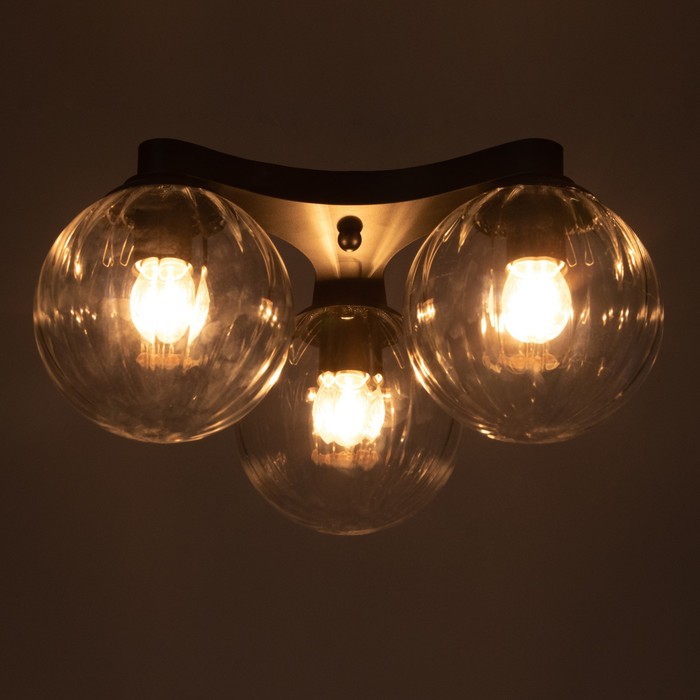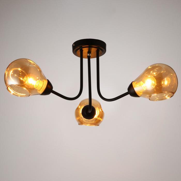 Современный свет для городской квартиры. Потолочная люстра 3-ламповая в стиле модерн – лаконичное решение для гостиной, кухни или спальни. Чёрный металлический корпус и золотистые стеклянные плафоны с... Показать описаниеоздают контрастную игру света и теней, добавляя интерьеру выразительности без излишней броскости. * Для помещений до 6 м?: Три лампы цоколем E27 мощностью до 40 Вт каждая обеспечивают равномерное освещение. Подходит для стандартной высоты потолков, в том числе натяжных – при использовании светодиодных ламп. * Сборка без подвеса: Установка прямо на потолок с помощью планки. Минимальная и максимальная высота от потолка – 26 см, конструкция компактная, не давит зрительно. * Направление света – вниз и в стороны: Плафоны нестандартной формы рассеивают свет широко, создавая комфортный фоновый свет. Тёмные стеклянные абажуры с золотистым оттенком мягко приглушают яркость, избегая резких бликов. * Стиль «модерн» в деталях: Чёрный каркас и золото стекла работают как архитектурный акцент. Не требует сложного интерьера – легко вписывается в минимализм, скандинавский стиль или лофт. Без лишних элементов: Управление без пульта, без дистанционного включения – только базовая функциональность. Лампы не входят в комплект, что даёт свободу выбора: использовать тёплое светодиодное свечение или классические лампы накаливания. IP20 означает защиту от пыли, но не от влаги – идеально для сухих помещений. Эта люстра не украшает потолок, она его завершает.