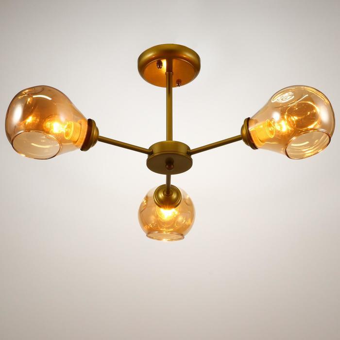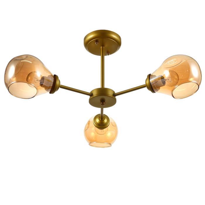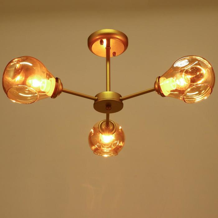 Свет с золотым оттенком. Трехрожковая люстра с плафонами из стекла – лаконичное потолочное решение для гостиной, кухни или спальни до 6 м?. Основание цвета золото, нестандартные плафоны в тёплом золот... Показать описаниеистом исполнении и металлическая штанга создают ощущение легкой торжественности без излишеств. * Компактное освещение с акцентом на стиль: Три лампы формата E27 по 40 Вт обеспечивают равномерный свет. Подходит для стандартных комнат: поддерживает базовое освещение, не перегружая пространство. * Установка на штанге: Конструкция крепится на планку, выступает от потолка ровно на 27 см. Форма не плоская, но остаётся компактной. Уместна в интерьерах с натяжными потолками – при использовании светодиодных ламп. * Направление света – вниз и в стороны: Стеклянные плафоны тёмных тонов мягко рассеивают свет, снижая яркость и создавая уютную атмосферу. Особенно выразительно смотрится вечером, когда свет играет на золотистых поверхностях. * Модерн в деталях: Золотое основание и одинаковый оттенок плафонов работают как единая композиция. Не требует сложного дизайна интерьера – легко сочетается с минимализмом, скандинавским стилем или современным лофтом. Без лишних функций: Управление через обычный выключатель, пульт отсутствует. Лампы не входят в комплект – можно выбрать светодиодные с тёплым светом или классические лампы накаливания. IP20 означает защиту только от контакта с крупными предметами – установка допустима только в сухих помещениях. Эта люстра не привлекает внимание к себе – она делает заметнее интерьер.
