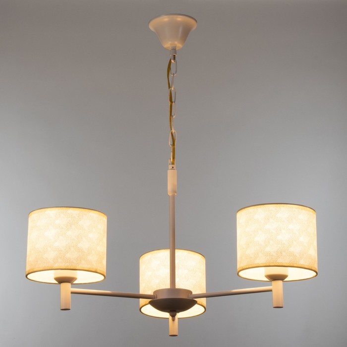 Свет, который начинается с потолка. Подвесная люстра 3-ламповая с кремовыми текстильными абажурами – классическое решение для гостиной, спальни, кухни или прихожей до 6 м?. Белое металлическое основан... Показать описаниеие и три цилиндрических абажура из ткани в светлых тонах создают мягкое, рассеянное свечение, наполняющее комнату уютом. * Освещение для компактного пространства: Три лампы E27 по 40 Вт обеспечивают равномерный свет без перегрузки. Подходит как для повседневного использования, так и для вечернего режима, когда важна атмосфера, а не яркость. * Установка под крюк с регулировкой высоты: Минимальная высота от потолка — 38 см, максимальная — 78 см. Возможность настройки позволяет адаптировать люстру под разную высоту потолков, включая монтаж на натяжные конструкции — при использовании светодиодных ламп. * Свет направлен вверх: Цилиндрические кремовые абажуры передают свет на потолок, создавая эффект фонового, парящего освещения. Текстиль мягко рассеивает свет, делая его визуально тёплым и комфортным для глаз. * Классический стиль в современном исполнении: Симметричная форма, светлая палитра, отсутствие излишнего декора. Работает как универсальный элемент интерьера — гармонично вписывается как в традиционные, так и в современные решения с акцентом на уют. Без лишних опций: Управление через настенный выключатель, пульт не предусмотрен. Лампы продаются отдельно — можно выбрать светодиодные с нужной температурой света. Степень защиты IP20 указывает на установку только в сухих помещениях. Эта люстра не доминирует в интерьере — она его смягчает.
