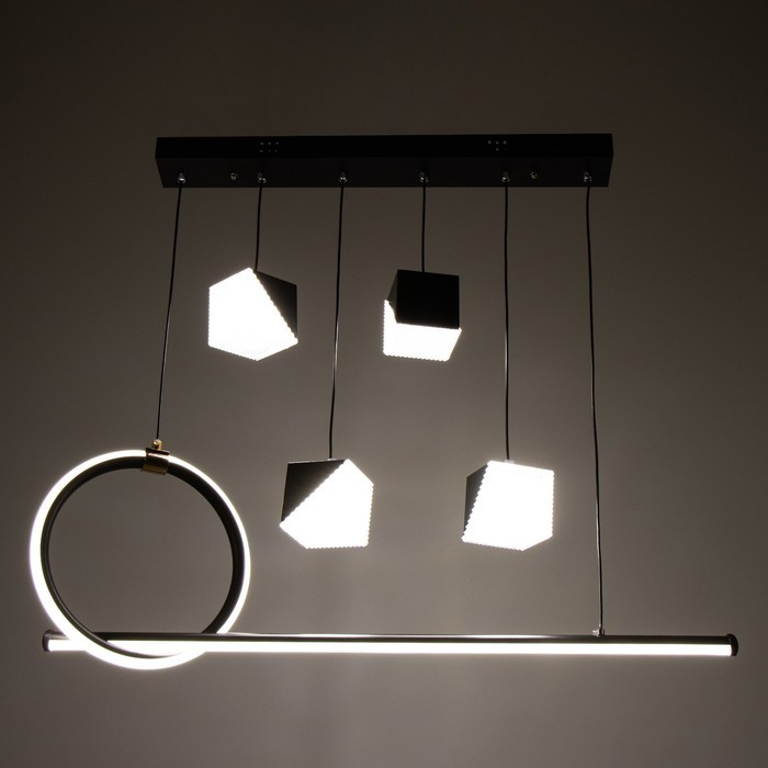 Свет, который формирует пространство Подвесной LED-светильник 6 плафонов, чёрный, с регулировкой цветовой температуры — это мощное решение для гостиной, кухни или лестничного пролёта. Дизайнерская фор... Показать описаниема, высокая освещённость и встроенная LED-подсветка делают его не просто источником света, а элементом интерьера с функциональной нагрузкой. * Яркость на уровне проектов: 8820 лм и площадь покрытия до 18 м? — светильник справляется с основным освещением даже в просторных зонах. Мощность 126 Вт распределена между шестью светодиодными модулями, каждый из которых работает в диапазоне 3000–6000 К: от тёплого до холодного света. * Открытая конструкция без плафонов: Свет направлен строго вниз, без рассеивания в стороны. Это обеспечивает чёткие границы освещения, минимум бликов и максимальную концентрацию на рабочей поверхности — особенно актуально для кухни или обеденной зоны. * Гибкая установка: Крепление на планку и проводной подвес с возможностью регулировки высоты (от 27 до 117 см) позволяют адаптировать люстру под разные высоты потолков. Подходит для натяжных конструкций — при условии использования светодиодных источников. * Дизайн как часть интерьера: Чёрный металлический каркас, комбинация круглых и квадратных форм — светильник выдержан в стилистике современного модерна и подходит для интерьеров с акцентом на графичность и технологичность. Готов к работе сразу: Лампы встроены — дополнительные покупки не нужны. Управление через общий выключатель, без пульта. Подходит для помещений с постоянным использованием света: гостиных, кухонь, холлов. Это не украшение для потолка — это инструмент освещения, спроектированный как объект дизайна.