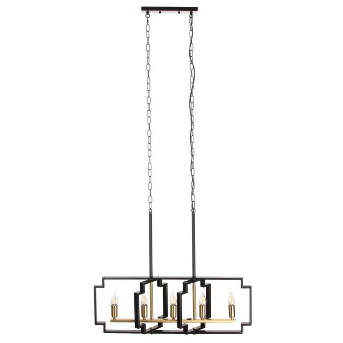 Элегантный акцент для вашего интерьера! Подвесная люстра BayerLux в черно-золотом исполнении — это стильный светильник с пятью плафонами «под свечу». Сочетание черного матового металла и золотых акцен... Показать описаниетов создает эффектный контраст. * Пять цоколей E14: Используйте лампы-свечи мощностью до 40 Вт. Модель подходит для создания атмосферного освещения с теплым рассеянным светом. * Регулируемая высота подвеса: Цепь позволяет установить светильник на высоте от 25 до 97 см от потолка. Вы можете выбрать оптимальный уровень для разного типа помещений. * Направленный вверх свет: Плафоны формы «под свечу» создают мягкое отраженное освещение. Такой свет комфортен для глаз и создает уютную атмосферу. * Стильное сочетание цветов: Черный матовый металл с золотыми элементами выглядит современно и элегантно. Люстра становится акцентным элементом интерьера. Практическое применение: Светильник освещает помещения до 10 м? и подходит для гостиной, кухни, офиса или коммерческих пространств. Монтаж на стандартную планку делает установку простой. Совместимость с натяжными потолками при использовании светодиодных ламп расширяет возможности применения.