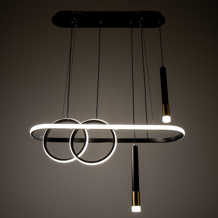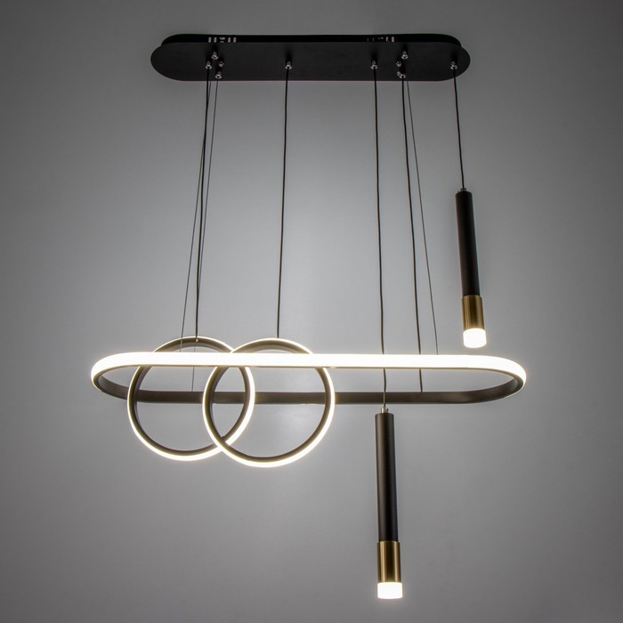Свет, который держит форму пространства. Подвесная LED-люстра с регулируемой высотой и кольцевой конструкцией – современное решение для гостиной, спальни, кухни или интерьеров кафе и ресторанов до 7 м... Показать описание?. Золотистый металлический каркас и два встроенных светодиодных модуля создают объёмное, равномерное свечение без плафонов и лишних деталей. * Гибкость по высоте: Подвес на тросе позволяет выставить длину от 40 до 106 см. Это делает люстру универсальной для помещений с разной высотой потолков – от стандартных квартир до высоких залов. * Мощность с контролем тона: Общая мощность 65 Вт, световая температура регулируется от тёплого (3000 К) до дневного (6000 К). Позволяет переключаться между уютным вечерним светом и ярким дневным без замены ламп. * Открытая форма кольца: Свет исходит со всех сторон металло-пластикового корпуса светлых тонов. Отсутствие плафонов усиливает эффект парящего объёма, охватывая пространство по горизонтали и визуально расширяя его. * Дизайн как центр композиции: Чёткая геометрия, золото, минимализм с акцентами хай-тека и модерна. Работает как архитектурный элемент интерьера – подходит для современных, дизайнерских и коммерческих пространств. Простота в установке и использовании: Крепление на планку, управление через выключатель, пульт не предусмотрен. Встроенные LED не требуют обслуживания. Совместима с натяжными потолками при использовании светодиодного освещения. Степень защиты IP20 — только для сухих помещений. Эта люстра не украшает комнату – она её формирует.