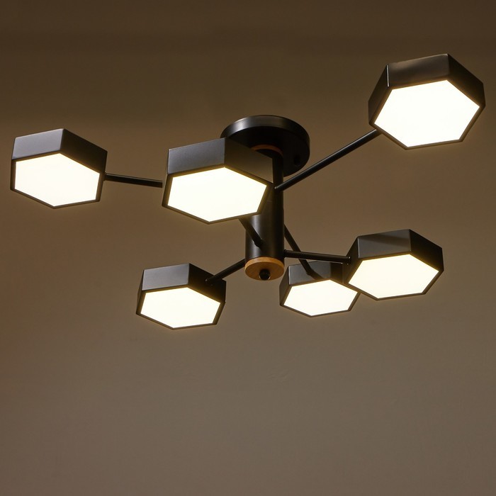 Свет, который держит пространство в фокусе. Потолочная LED-люстра с регулируемой температурой света – эффективное решение для гостиной, кухни или спальни до 15 м?. Чёрный металлический каркас с элемен... Показать описаниетами дерева, шесть встроенных светодиодных модулей и шестиугольные плафоны из пластика и металла создают насыщенное, направленное освещение без потерь. * Мощность с контролем атмосферы: Общая мощность 144 Вт, световой поток — от 11?520 до 13?600 лм. Температура света регулируется от тёплого (3000 К) до дневного (6000 К). Подходит как для вечернего отдыха, так и для активного использования днём. * Установка на штанге: Крепление на планку, высота конструкции — 25 см. Габариты 71?65 см обеспечивают широкий охват при умеренных пропорциях. Удобна для стандартных помещений, включая установку на натяжные потолки. * Направленный свет вниз: Шестиугольные чёрные плафоны в тёмных тонах фокусируют свет строго вертикально, минимизируя рассеяние. Обеспечивает равномерное покрытие пола и центральных зон без теней. * Современный стиль с графичной выразительностью: Чёткая геометрия, контраст цветов, сочетание матового металла и текстурированного дерева. Работает как архитектурный элемент интерьера — уместна в стилях модерн, скандинавский и современный минимализм. Готова к работе сразу: Встроенные LED не требуют замены. Управление через выключатель, пульт не предусмотрен. Совместима с натяжными потолками при использовании светодиодного освещения. Степень защиты IP20 — только для сухих помещений. Эта люстра не украшает комнату — она её определяет.