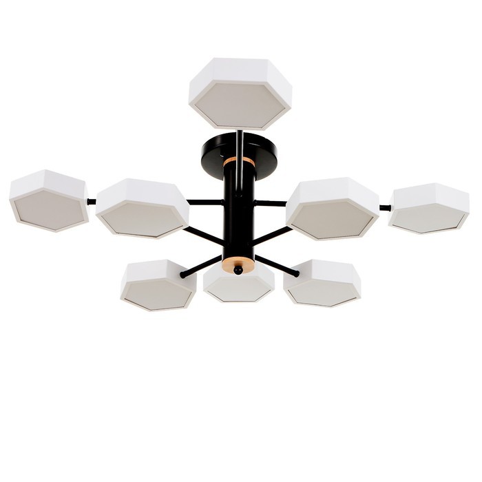 Свет, который охватывает пространство без лишнего шума. Потолочная LED-люстра с регулируемой температурой света – функциональное решение для гостиной, кухни или спальни до 20 м?. Комбинация белого и ч... Показать описаниеёрного в основании, восемь встроенных светодиодных модулей и шестиугольные плафоны из пластика и металла создают равномерное, насыщенное освещение с акцентом на комфорт. * Мощность с контролем атмосферы: Общая мощность 192 Вт, световой поток — от 15?360 до 18?300 лм. Температура света регулируется от тёплого (3000 К) до дневного (6000 К). Подходит как для уютного вечера, так и для активного дня без перегрузки. * Установка на штанге: Крепление на планку, высота конструкции — 25 см. Габариты 86?86 см обеспечивают широкий охват, при этом люстра не давит визуально. Подходит для натяжных потолков при использовании светодиодного освещения. * Направленный свет вниз: Шестиугольные белые плафоны светлых тонов фокусируют свет строго вниз, минимизируя потери. Равномерное распределение по площади исключает тёмные зоны, особенно в центре комнаты. * Дизайн для современного интерьера: Чёткая геометрия, сочетание дерева и металла, минимализм. Уместна в стилях модерн, скандинавский и современный дизайн, где важны свет, натуральные текстуры и лаконичность форм. Готова к работе сразу: Встроенные LED не требуют замены. Управление через выключатель, пульт не предусмотрен. Степень защиты IP20 — установка только в сухих помещениях. Эта люстра не бросается в глаза — она создаёт фон, на котором раскрывается весь интерьер.