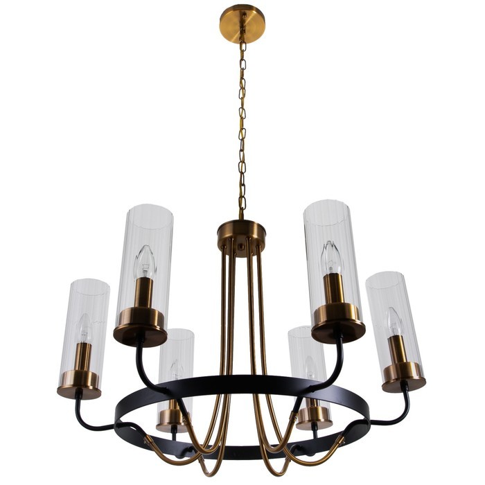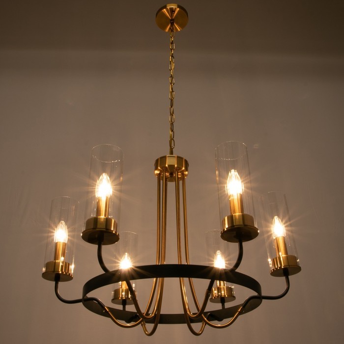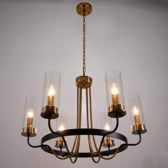 Свет, подвешенный на цепи времени. Подвесная люстра с цилиндрическими плафонами и черно-золотым каркасом — выразительный элемент освещения для кухни, гостиной или лестничного пролёта. Её высота регули... Показать описаниеруется от 32 до 47 см, что делает её уместной как в просторных, так и в двухуровневых интерьерах. Металлический основание в цвете чёрное золото и прозрачные стеклянные плафоны создают образ между современным модерном и замковой эстетикой. * Шесть патронов E14, мощность до 40 Вт: Поддерживает лампы накаливания, но рекомендуется использовать светодиодные — они безопасны для натяжных потолков, потребляют меньше энергии и служат дольше. Возможность выбрать форму и стиль ламп добавляет гибкости в дизайн. * Цепной подвес — точка фокуса в интерьере: Конструкция с цепью придаёт светильнику ощущение веса и аутентичности. Часто используется в лофтах, классических кухнях, холлах — там, где важна визуальная опора и объём. * Прозрачные стеклянные цилиндры, свет направлен вверх: Плафоны пропускают свет без искажений, часть излучения уходит на потолок, создавая эффект парения. Основной акцент — на объёме и свечении, а не на яркости рабочей зоны. * Металлическое основание и крепление на планку: Каркас из прочного металла выдерживает вес конструкции. Фиксация надёжная, установка возможна на бетон, гипсокартон и натяжные потолки — при использовании LED-ламп. Когда выбирать эту люстру: Если вам нужен светильник, который работает как декоративный объект, а не просто источник света. Она подходит для помещений до 12 м?, где важна атмосфера — вечернее мягкое свечение, игра теней, намёк на винтаж. Управление — через общий выключатель, без пульта: простота вместо лишних функций. Эта модель — выбор для тех, кто ценит характер, контраст форм и возможность собрать свет по своему вкусу.