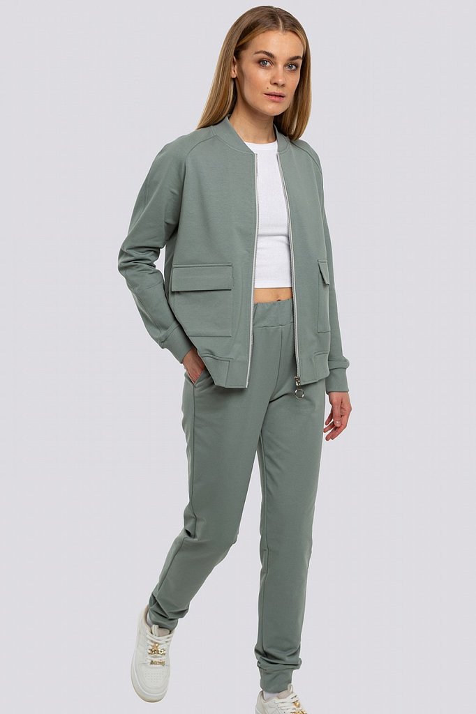 Cтиль спорт шик утвердился в списке самых популярных трендов и с тех пор не покидает пьедестал. Женский костюм в стиле спорт шик сочетает в себе привлекательность, выразительность и высокий уровень ко... Показать описаниемфорта. Локаничный, свободный свитшот с металлической молнией до уровня груди и воротником стойкой. На груди два накладных кармана с клапанами. Низ слегка выгнутой формы. Брюки среднего объёма, без лишних деталей, пояс на резинке, по низу манжеты. Состав трикотажа: 75% хлопок, 20% полиэстер, 5% спандекс.
