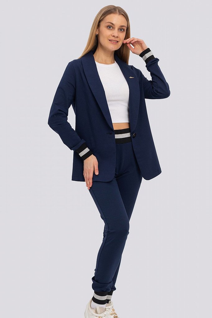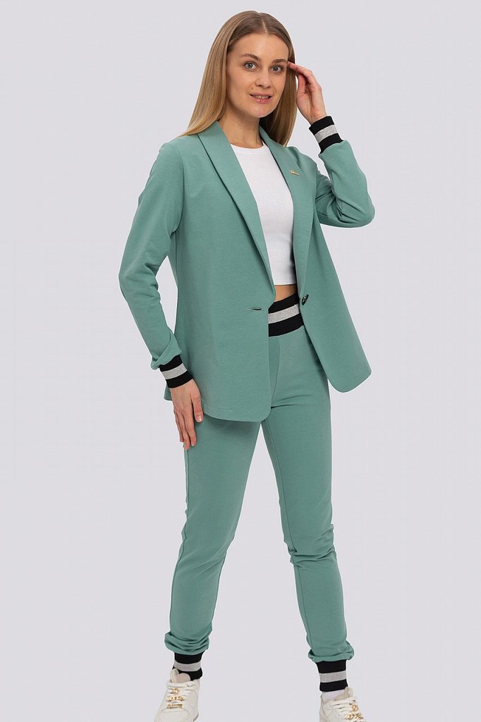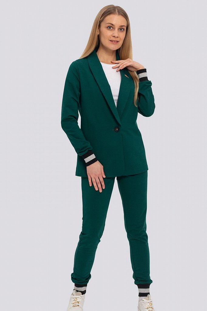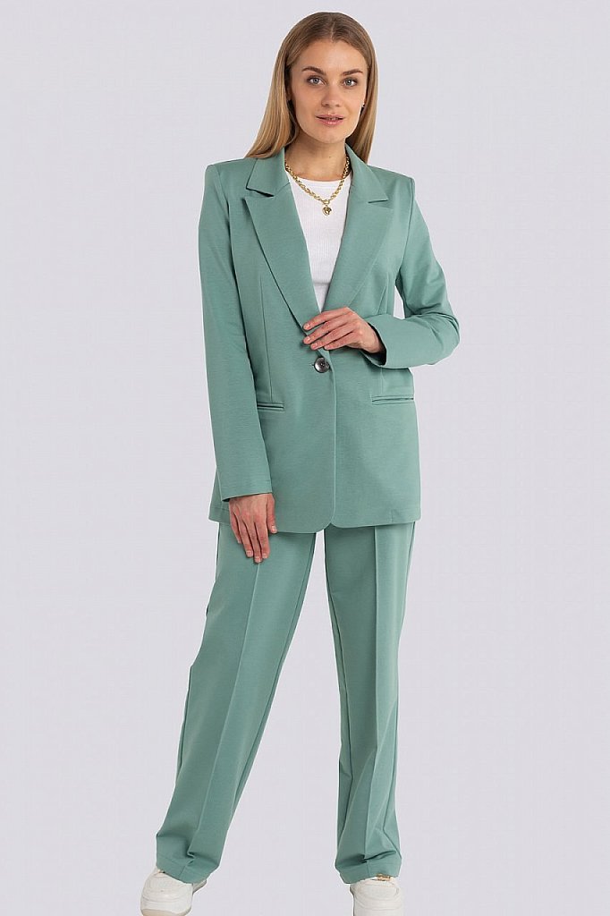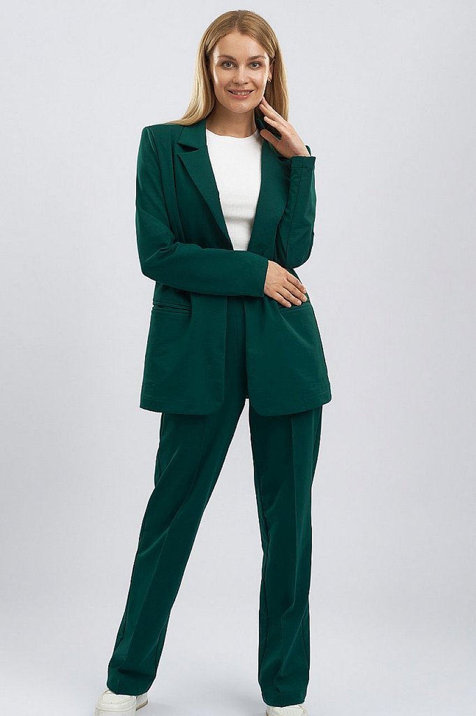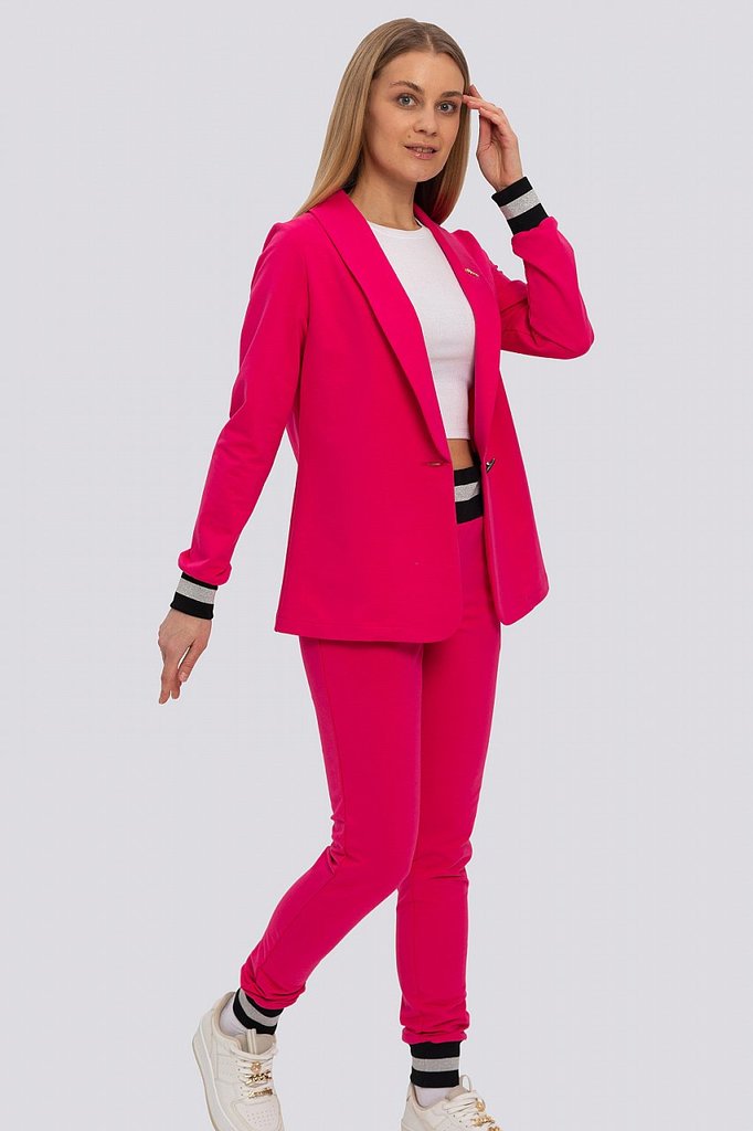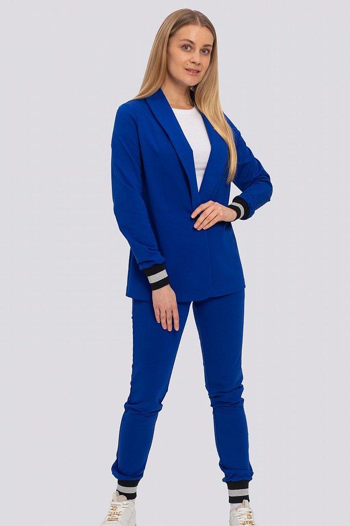 Классический костюм всегда был в моде, такие костюмы подходят всем, независимо от фигуры. Их можно носить с блузками, рубашками, для того, чтобы создать строгий образ. Для повседневного ношения можно ... Показать описаниенадеть свитер или топ. Современные женщины готовы носить модный костюм с брюками по любому поводу и это правильно. Более того, женский брючный костюм входит в топ вещей, без которых представить себе актуальный женский гардероб в сезоне 2023-2024 будет немыслимо. Жакет с воротником английского типа, свободного объема, полуприлегающего силуэта. Застежка на пуговицу, элегантные карманы в рамку. Брюки широкие, стрелка застрочена, со шлевками, пояс частично с резинкой. Посадка брюк – высокая, на талии. В очередной раз пришла в моду палитра сочных оттенков – фуксия, ярко-синий, зеленая мята – наш выбор. Модель представлена из трикотажной ткани, что предоставляет максимум комфорта в носке. Ткань не мнется, не вытягивается и не выгорает. Состав трикотажа: 75% хлопок, 20% полиэстер, 5% спандекс.