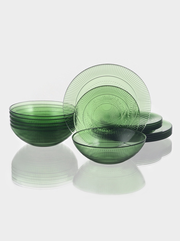 Посуда Luminarc «Луиз» на 6 персон — компактный, но полноценный набор для повседневного стола. Преимущества * Изготовлен из прочного стекла Luminarc, устойчивого к сколам. * Рельефная текстура на таре... Показать описаниелках обеспечивает удобный и надёжный хват. * Однотонный дизайн шартрез легко вписывается в разные стили интерьера. * Зелёный цвет «шартрез» — редкий и узнаваемый выбор среди стандартных оттенков посуды. * Подходит для горячих и холодных блюд, сохраняя целостность формы и внешний вид при многократном использовании. Комплектация * тарелка обеденная плоская d=25 см — 6 шт; * тарелка десертная плоская d=19 см — 6 шт; * тарелка глубокая 1 л, d=20 см — 6 шт. Дополнительно Можно мыть в посудомоечной машине и использовать в СВЧ-печи