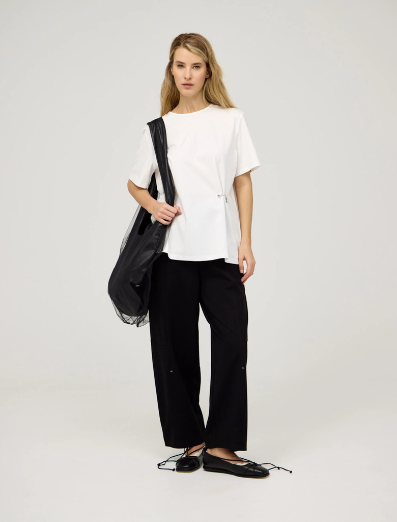 Видео: https-//hassfashion.ru/upload/iblock/f98/3ap3z1k0ofntq22rlwu985w3coh6ea5y.mp4 весна-лето 60% Лен, 40% Тенсел Брюки зауженного к низу силуэта с резинкой и затяжниками по поясу.