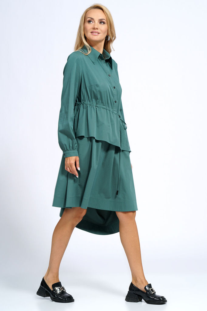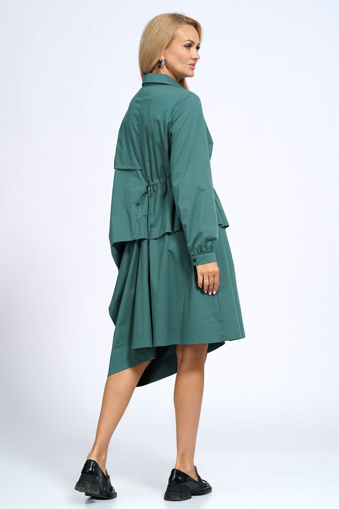Состав: Хлопок-98%; Эластан-2%; Сезон: Осень-Зима Рост: 164 Страна бренда: Беларусь Состав: Хлопок-98%; Эластан-2%; Платье женское А- образного силуэта, с застёжкой смещенной влево по притачной планке... Показать описание на петли, пуговицы, по линии талии правой стороны кулиса с завязкой и фиксаторами фиксируемая степень прилегания и баска переходящая в мягкую драпировку по левому боковому, с разноуровневым низом. Перед с нагрудными выточками. Спинка со средним швом и отлетной кокеткой верху по левой части. Рукава втачные, одношовные, длинные понизу с разрезом, сборкой и притачными манжетами на петлю и пуговицу. Воротник стояче-отложной на отрезной стойке застёгивающаяся на петлю и пуговицу.