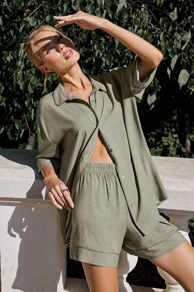 Состав: Хлопок-86%; Лён-14%; Страна бренда: Польша Состав: Хлопок-86%; Лён-14%; Представляем вам комплект Octavia — спокойное сочетание комфорта и стиля, созданное для ваших моментов расслабления. Это... Показать описаниет комплект, изготовленный из лёгкой хлопково-льняной ткани, окутает вас ощущением спокойствия благодаря успокаивающему оттенку приглушённого оливкового цвета. Свободная рубашка на пуговицах длиной до локтя может похвастаться классическим воротником, закруглённым низом и привлекательными декоративными пуговицами по всей длине спинки, которые добавят вашему образу немного оригинальности. Широкие шорты с высокой талией, эластичным поясом, декоративными пуговицами и практичными карманами. Этот ансамбль излучает непринуждённую элегантность. Комплект Octavia позволит вам выглядеть непринуждённо и элегантно, не отказываясь от комфорта, и наслаждаться каждым моментом.