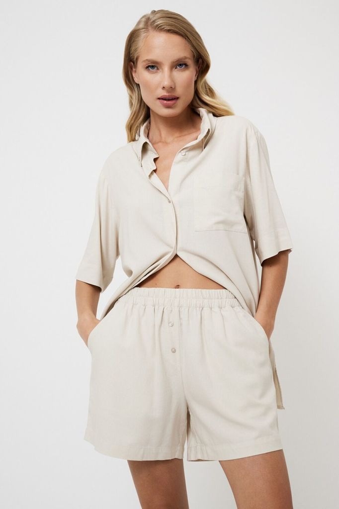 Состав: Вискоза-29%; Хлопок-58%; Тенсел-13%; Страна бренда: Польша Состав: Вискоза-29%; Хлопок-58%; Тенсел-13%; Представляем вам комплект Lorraine — шикарный ансамбль, созданный для того, чтобы сделат... Показать описаниеь ваш отдых на побережье более комфортным и стильным. Он изготовлен из хлопковой ткани с вискозой и с добавлением тенселя, приятно прилегает к коже, а спокойный однотонный цвет излучает неподвластную времени элегантность. Топ на пуговицах с короткими рукавами, украшенный классическим воротником и стильными подвернутыми рукавами, придаст вашему гардеробу непринужденную изысканность. Шорты с эластичным поясом и разрезами по бокам. Этот ансамбль обеспечивает свободу движений. Независимо от того, наслаждаетесь ли вы уютным днём дома или греетесь на солнце на берегу, комплект Lorraine обеспечит вам комфорт.