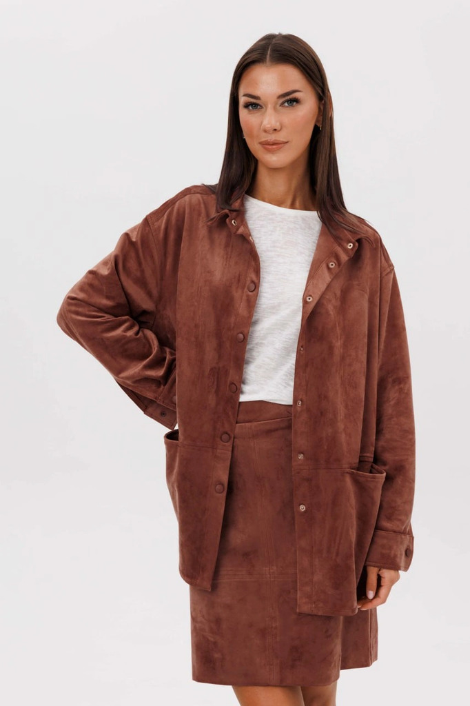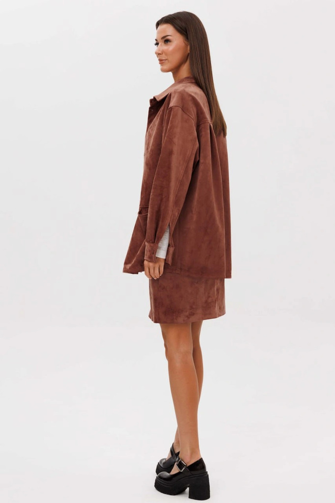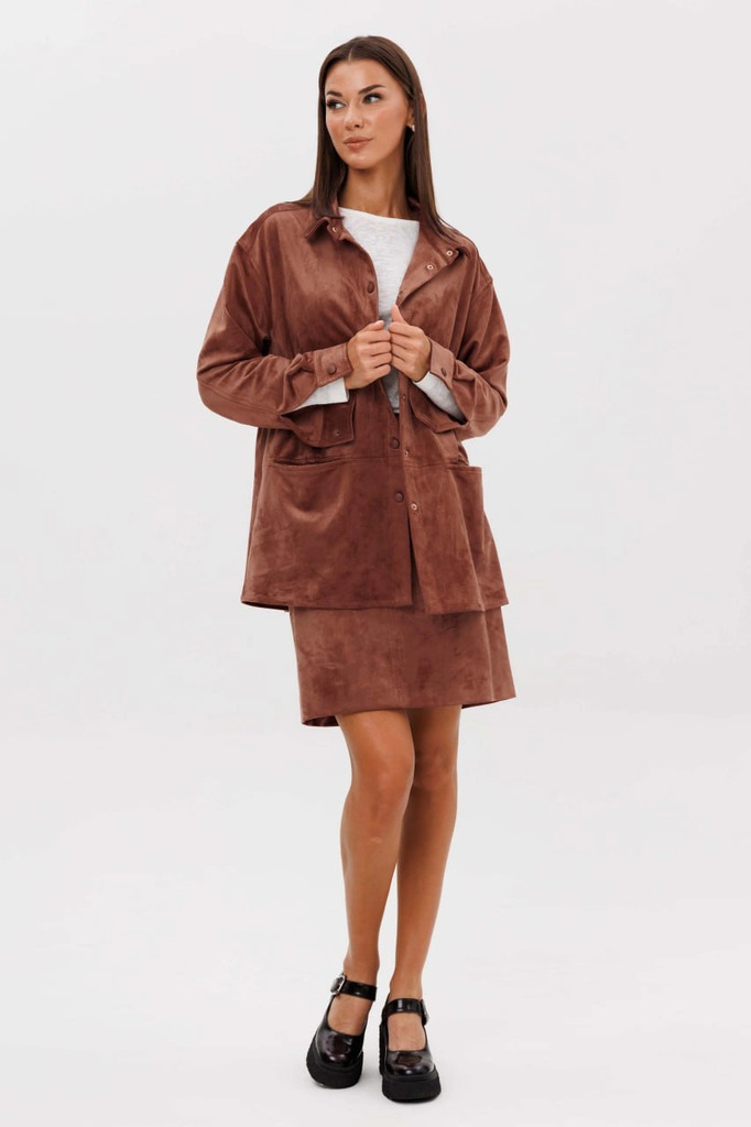 Замша уже несколько сезонов подряд удерживает статус одного из главных трендов. Для тех кто следит за модными новостями, это неудивительно: эта благородная фактура стала основой большинства модных диз... Показать описаниеайнерских коллекций. Эффектная, она органично вписывается в самые разные образы. Образ, который говорит сам за себя, смелый и дерзкий, и в то же время очень комфортный. Рубашка из замши-нестандартная, но стильная альтернатива куртке, но на более теплую погоду. Свободный, расслабленный силуэт, рубашечный покрой, центральная застежка на кнопки. Полочка с горизонтальным членением ниже линии талии и карманом в шве. Спинка с отрезной кокеткой и мягкими складками. Рукав с локтевым швом, разрезом в нем, мягкой складкой и притачной манжетой по низу. Низ изделия-фигурный. Воротник-классический рубашечный. Юбка из замши-это изюминка осеннего гардероба, позволяющая создавать любые образы, воплощая ваши самые смелые идеи. Юбка на притачном поясе, эластичном в области спинки, силуэт слегка А-образный. Переднее полотнище со швом по центру и горизонтальным членением, заднее полотнище с талиевыми вытачками, центральным швом и горизонтальным членением. Застежка в боковом шве на потайную молнию. Юбка на эластичной подкладке. Длина рубашки около 75 см. Длина рукава с плечом около 74 см. Длина юбки около 48 см. пэ 90%, вискоза 6%, спандекс 4%