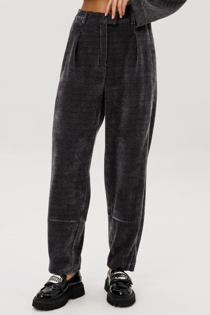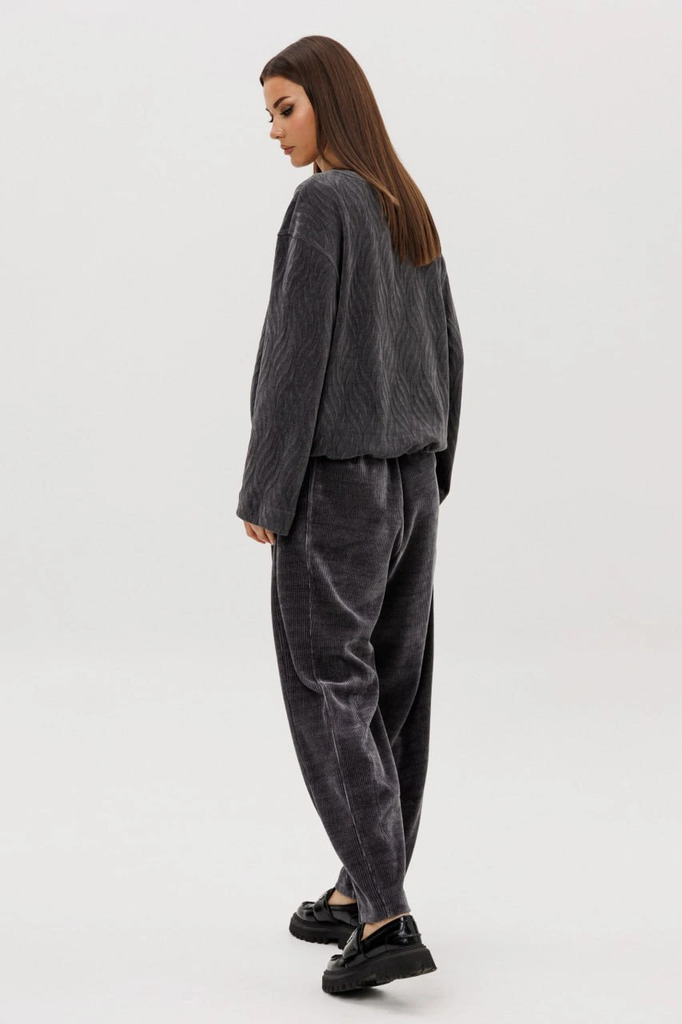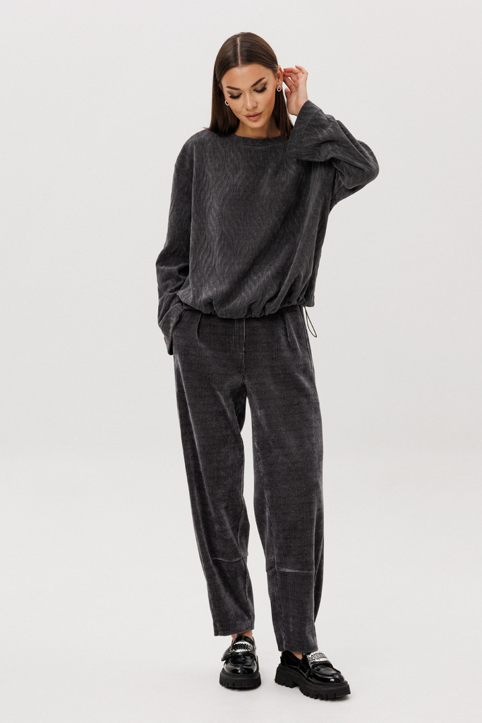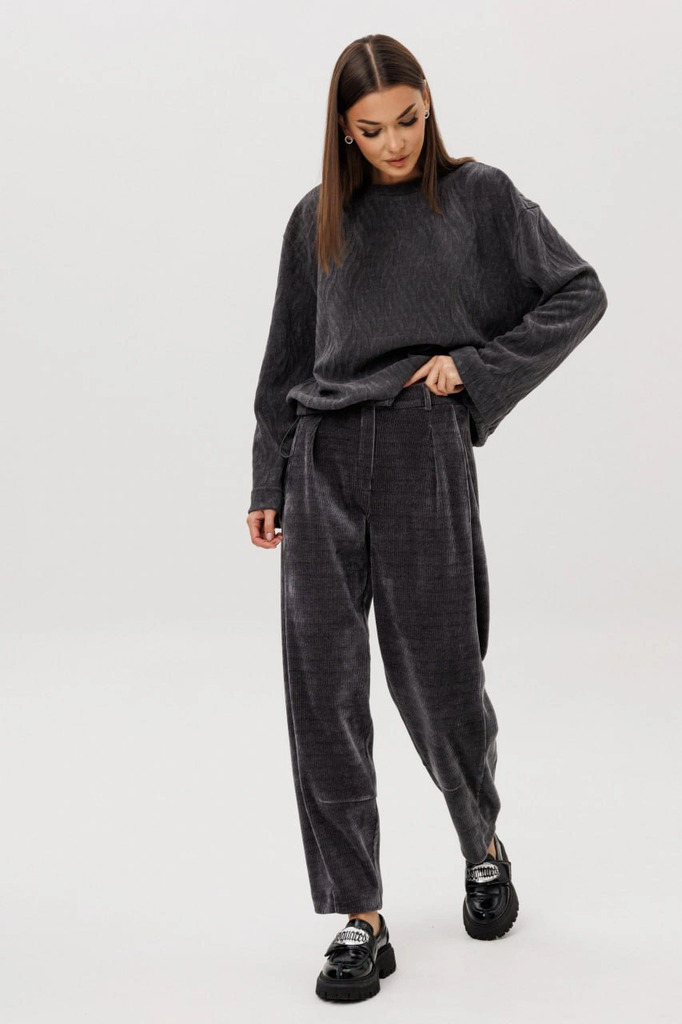 "Трикотажный костюм с брюками станет отличным выбором для повседневных образов. В нём удобно и комфортно! Свободный джемпер расширенного силуэта втачного покроя на заниженной линии плеча. Рукав расшир... Показать описаниеенный в области оката. По низу  джемпера шнур- резинка с фиксаторами. Брюки """"баррел"""" на притачном поясе со шлёвками (эластичном в области спинки), с наклонными карманами , мягкими складками защипами по верху брюк." Джемпер: вискоза 75%, ПЭ 25% Брюки: ПЭ 88%, спандекс 12%