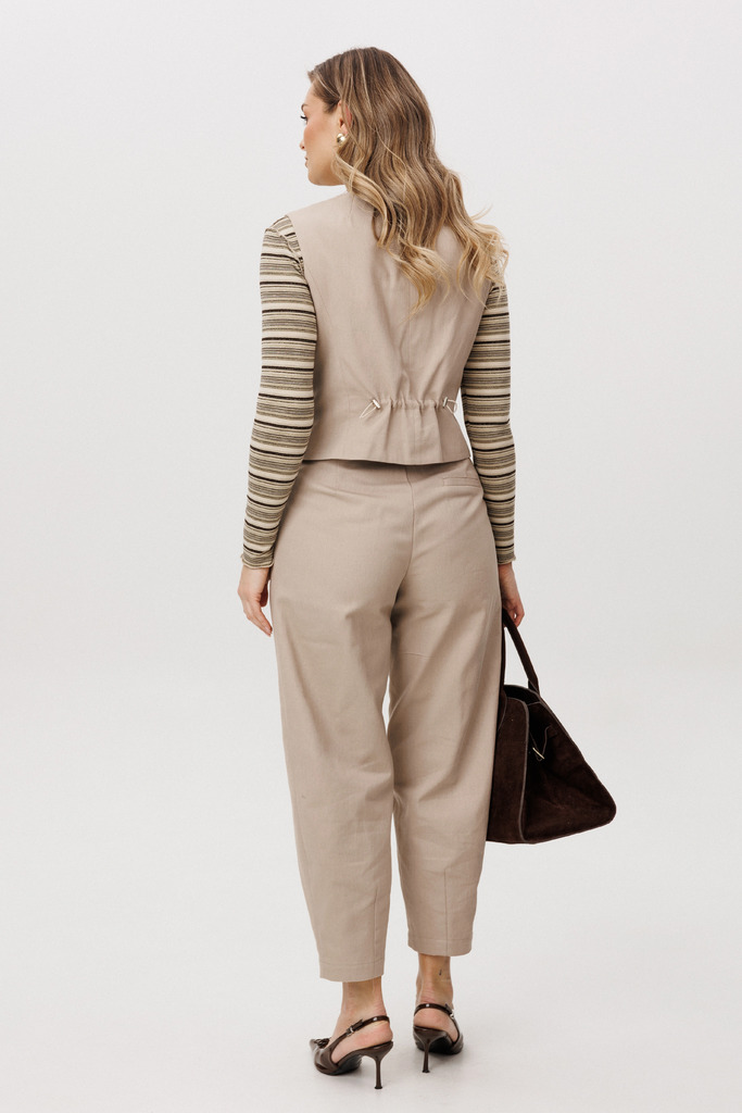 Костюм с жилетом - прекрасное решение для смелых экспериментов. Выполненный в нейтральной цветовой гамме, он позволяет дополнять себя различными аксессуарами и создавать каждый раз новые актуальные об... Показать описаниеразы. Жилет прямого силуэта с центральной застёжкой и фигурным разноуровневым бортом. Спинка с декоративной разноуровневой планкой, которая имитирует застежку. Брюки прямые расслабленного стиля, на притачном эластичном поясе с наклонными боковыми карманами. вискоза 55%, лен 43%, спандекс 2%