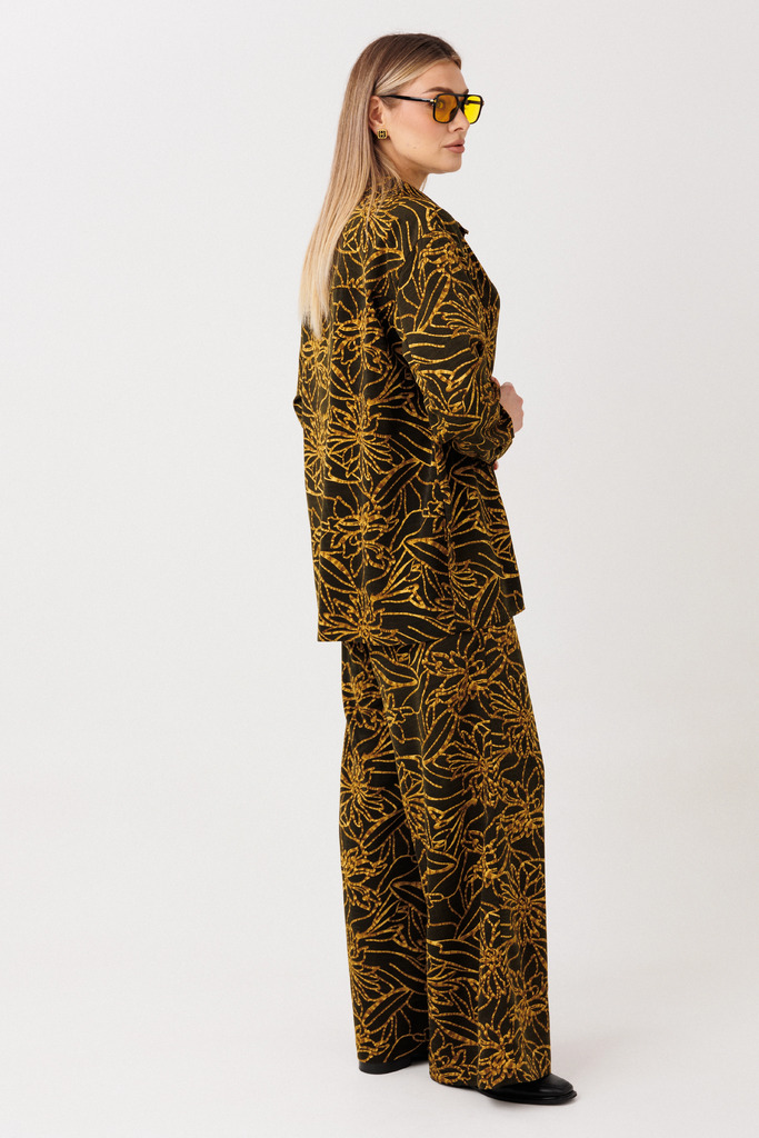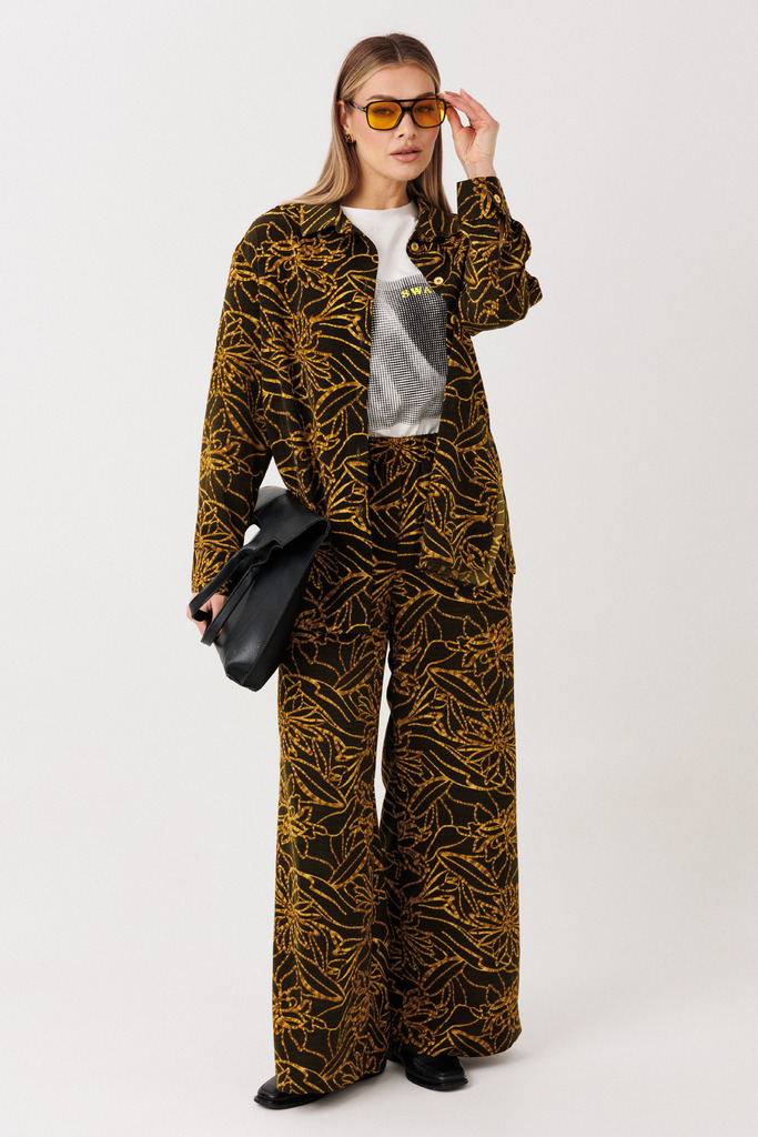 Брючный костюм, который с лёгкостью становится нарядным!Прежде всего, его выделяет роскошная ткань с геометрическим крупным рисунком, которая позволяет создать такой великолепный вариант брючного комп... Показать описаниелекта, который составит конкуренцию любому платью.Прямые линии, минимум декоративных элементов этот костюм как чистый лист, позволяет при помощи аксессуаров создать свои, неповторимые сеты.Свободная широкая рубашка и брюки-палаццо. Силуэт оверсайз, покрой рубашечный, воротник классический рубашечный с отрезной стойкой. Полоска, с отрезной кокеткой и накладным карманом. Спинка с отрезной кокеткой.Рукав с отрезной манжетой. Брюки на приточном поясе, эластичном в области спинки, с наклонными боковыми карманами.Длина рубашки около 75 см.Длина рукава с плечом около 74 см.Длина брюк около 108 см ПЭ 64%, вискоза 34%, спандекс 2%.