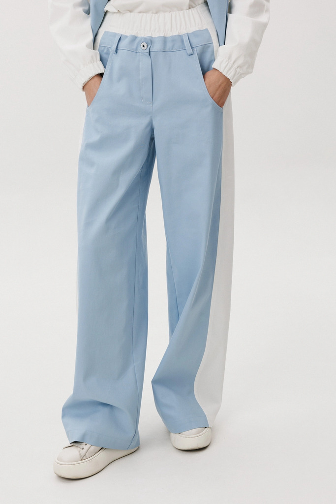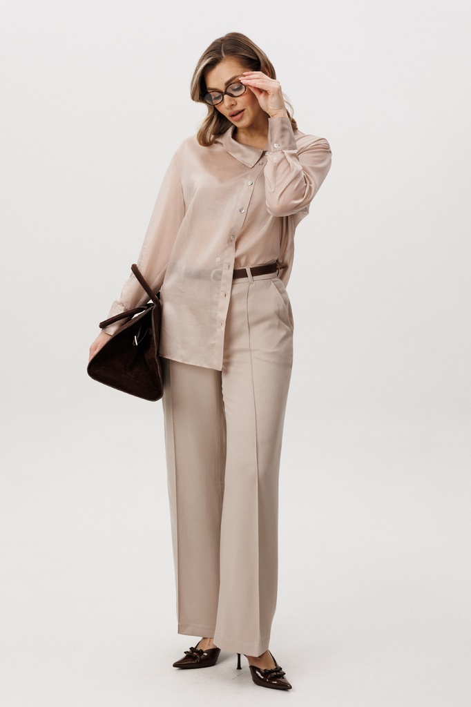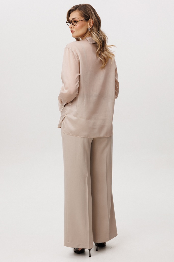Великолепная двойка: брюки и блуза в одном цвете, но из разнофактурных материалов. Нарочитая женственность, подчеркнутая полупрозрачностью верха и пластичностью брюк. Брюки свободного покроя, высокой ... Показать описаниепосадки с притачным поясом со шлёвками. Передние половинки брюк со стрелкой-защипом и боковыми наклонными карманами. На задних половинках брюк - прорезной карман с кисточкой. Блуза свободного кроя с рубашечным рукавом, ассиметричной застёжкой, разноуровневым низом, рубашечным воротником. Рукав с притачной манжетой и застежкой на петли и пуговицы. Длина брюк около 105 см. Длина рубашки около 70 см. Длина рукава около 60 см. рубашка: тенсил 90%, пэ 10%; брюки: пэ 64%, вискоза 34%, спандекс 2%.