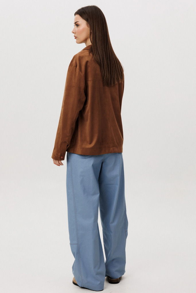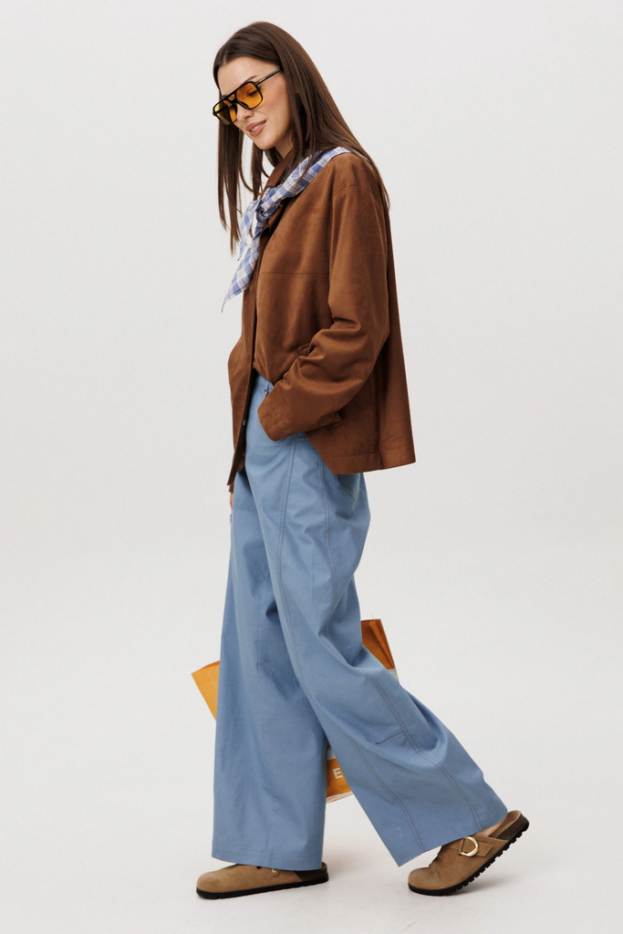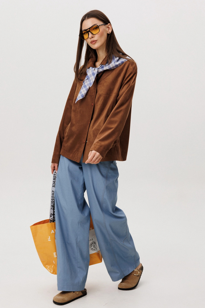 Стильный женский брючный костюм в стиле смарт-кэжуал сочетает комфорт и элегантность. Рубашка выполнена из замшевой ткани, брюки из джинсовой ткани тиффани. Идеальный выбор для повседневных образов. Р... Показать описаниеубашка: Свободный прямой силуэт, комфортная посадка. Материал под замшу в насыщенном оттенке. Классический отложной воротник. Застежка на кнопки. Практичные боковые карманы. Брюки "baggy" из денима, с интересным худящим эффектом, достигаемым за счет отрезной боковой части, смещенной на передних и задних половинках. Джинсы на отрезном поясе со шлевками, с фигурными карманами по передним половинкам. Задние половинки брюк с отрезной кокеткой и накладными карманами. Боковая часть брюк с отделочными вытачками, придающими легкий объем в области голени. Длина брюк около 106 см ВНИМАНИЕ! Платок не входит в комплектацию! Рубашка – полиэстер 90%, вискоза 6%, спандекс 4% Брюки -  хлопок 70% полиэстер  27% эластан 3%