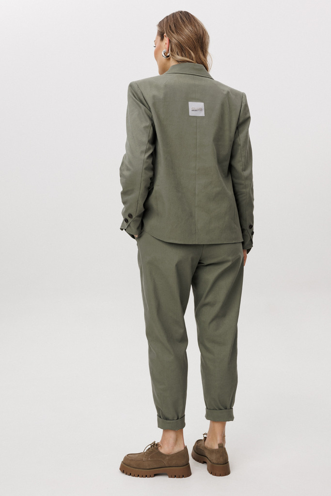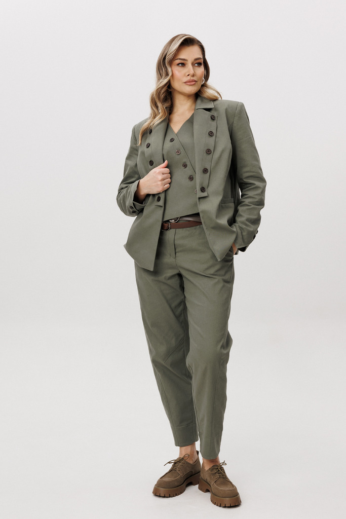 Льняной брючный костюм-это классика летнего гардероба. Когда наступает долгожданное тепло, мы с удовольствием демонстрируем свой новый льняной костюм. Лен визуально меняет восприятие костюма, делая ег... Показать описаниео более расслабленным по стилю: то, что нужно для летнего настроения. Свободный жакет упрямленного силуэта, втачного покроя с центральной застежкой и классическим пиджачным воротником. Полочка с прорезным карманом с клапаном, очередной кокеткой и потайной застежкой. Спинка с отрезной кокеткой и отлетной шлицей. Рукав двухшовный с отложной манжетой, фиксирующейся пуговицами. И невероятные брюки самого модного покроя "Barrel", на притачном поясе, эластичном в области спинки, наклонными боковыми карманами и глубокой складкой по передним половинкам. Длина жакета около 67 см. Длина рукава около 62 см. Длина брюк около 98 см. 55% лен, 45% вискоза