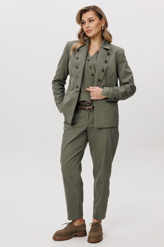Современная брючная тройка, сочетающая продуманный крой и комфорт повседневного гардероба. Модель выполнена в стиле casual и подходит для динамичного городского ритма, сохраняя аккуратный и собранный ... Показать описаниевнешний вид. Жакет отличается двубортной косой застёжкой, которая легко трансформируется в отложной лацкан. Лацкан фиксируется к полочке с помощью пуговиц, что позволяет менять характер образа — от более строгого к расслабленному. Жилет с асимметричной застёжкой и неровной линией низа добавляет образу архитектурность и подчёркивает дизайнерский подход. Брюки сложного кроя выполнены с цельнокроеным поясом спереди и притачным эластичным поясом на спинке, обеспечивающим комфортную посадку. Слегка зауженный книзу силуэт и наклонные боковые карманы формируют современную линию и визуально вытягивают фигуру. Костюм легко адаптируется под разные стилистические сценарии — от повседневных городских образов до smart casual, сочетаясь как с обувью на плоском ходу, так и с более акцентной парой. хлопок 70% пэ 27% эластан 3%