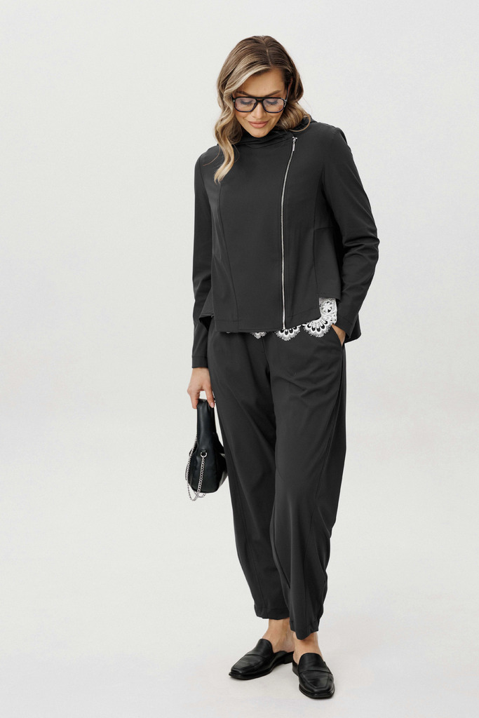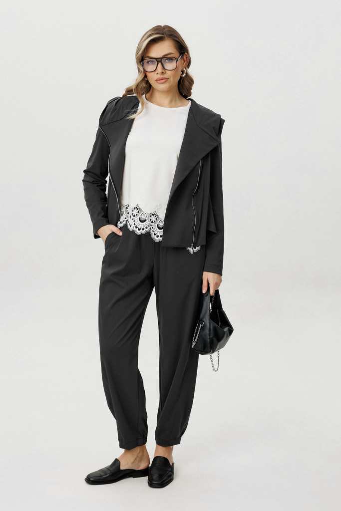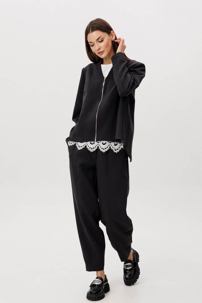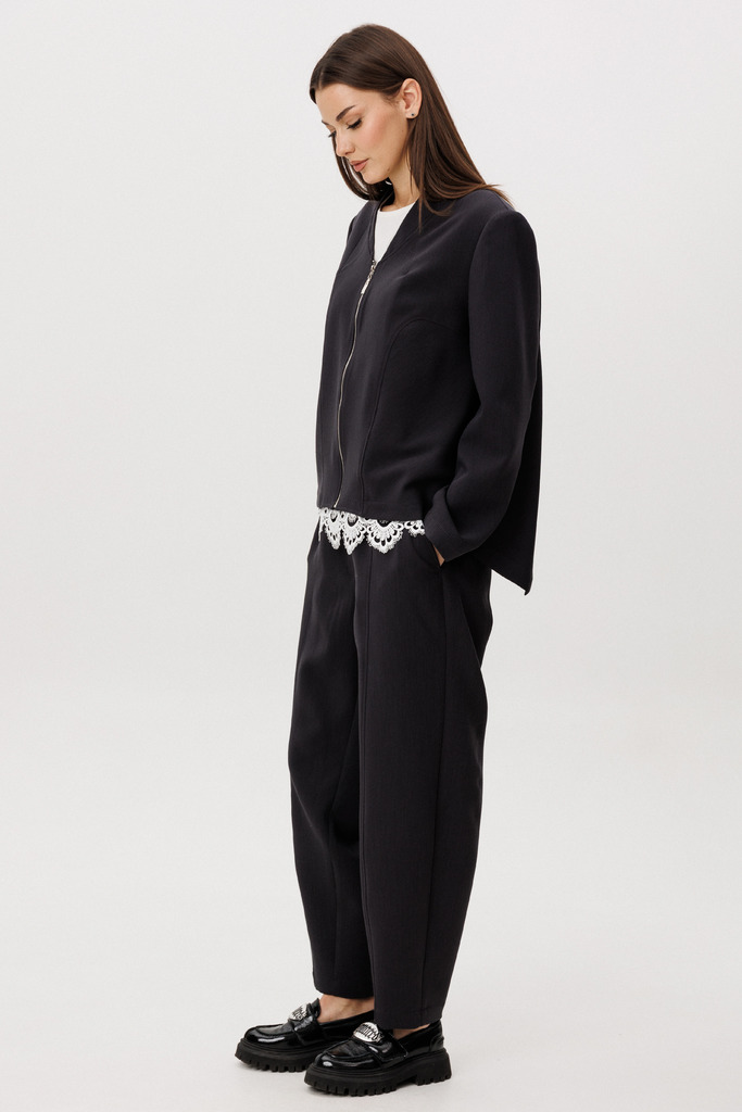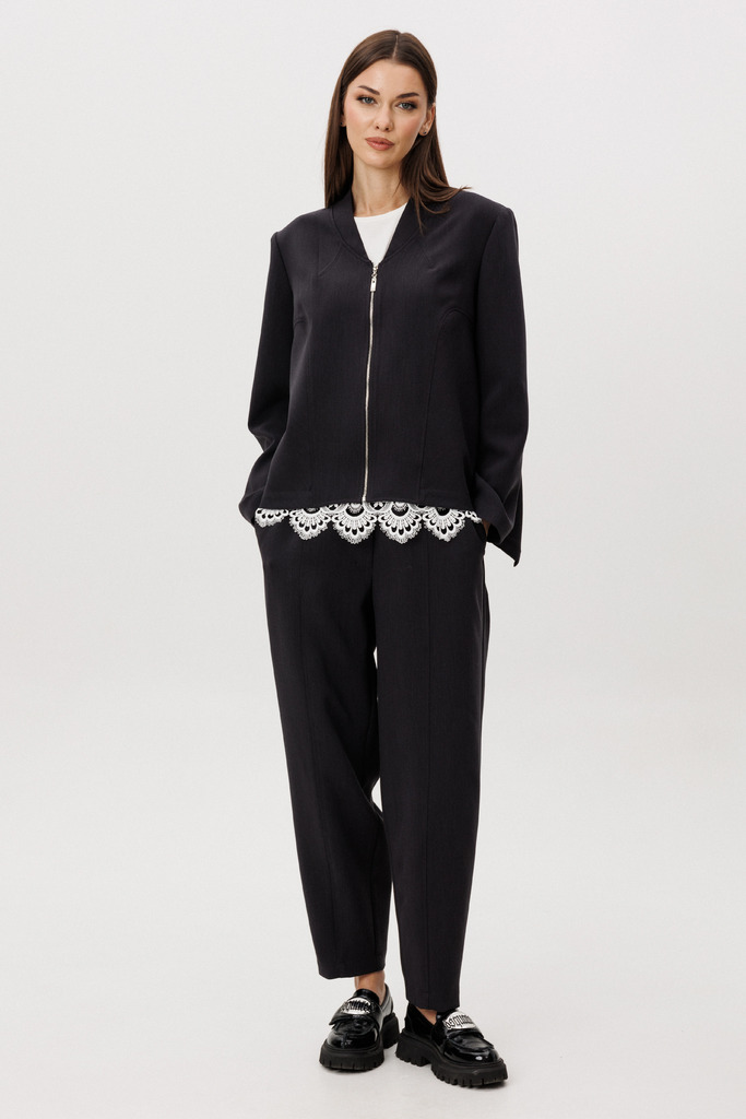 Современный костюм-тройка, в котором минимализм сочетается с продуманными дизайнерскими деталями. Жакет прямого силуэта выполнен со сложной архитектурной спинкой, создающей выразительный объём и подчё... Показать описаниеркивающей концептуальный характер модели. Застёжка на молнию добавляет образу графичность и современное звучание. Расслабленные брюки-бананы с мягкой линией кроя обеспечивают комфорт и формируют актуальный силуэт с лёгким акцентом на талии. Хлопчатобумажный топ, декорированный изящным кружевом по нижнему краю, добавляет образу контрастную женственность и завершённость. Костюм легко адаптируется под разные стилистические сценарии — от повседневного city-look до интеллектуального casual с акцентом на форму и фактуру. топ хлопок 96% эластан 4% жакет и брюки пэ 74% вискоза20% эластан 6%