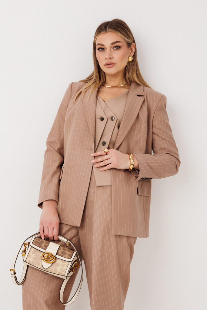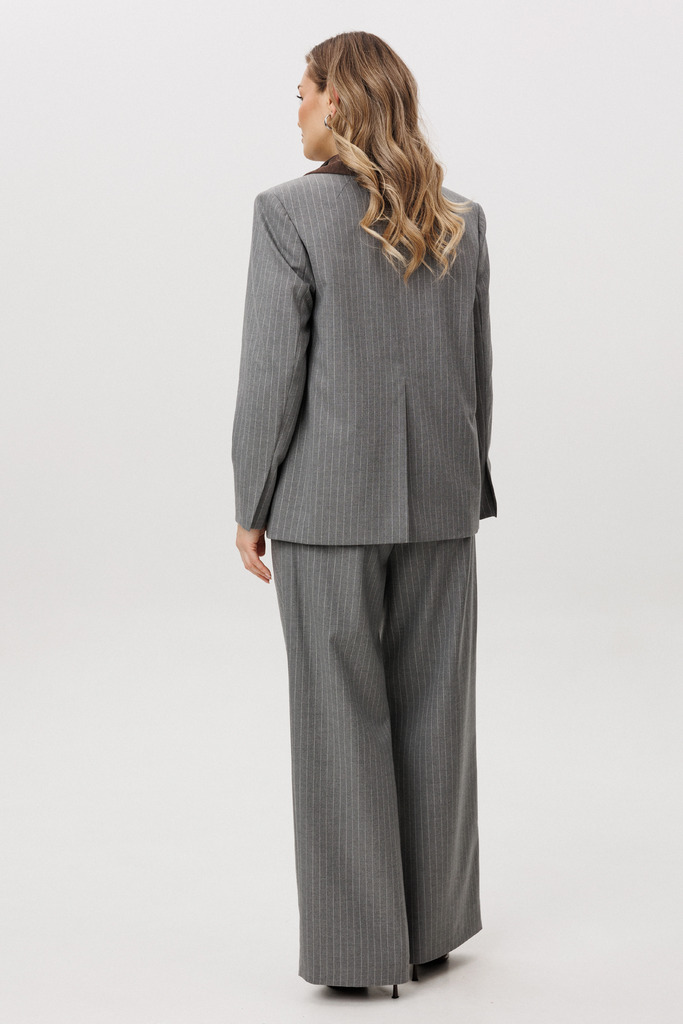Стильный и современный костюм 3-ка, который сочетает в себе элегантность классического кроя и расслабленный городской стиль. Жакет прямого силуэта выполнен в лаконичном дизайне с аккуратной застёжкой ... Показать описаниена пуговицы и чётко очерченными лацканами. Тонкая вертикальная полоска визуально вытягивает силуэт и придаёт образу утончённость. Брюки свободного кроя с высокой посадкой обеспечивают комфорт и свободу движений, формируя актуальный удлинённый силуэт. Внутренний слой в виде жилета на молнии добавляет образу многослойность и делает модель особенно универсальной. Верхний воротник жакета и жилета выполнен из отделочной штруксовой ткани контрастного оттенка. Костюм легко адаптируется под разные стили — от делового до smart casual. Идеально подходит как для офиса, так и для повседневных выходов. пэ 64% вискоза 34% спандекс 2