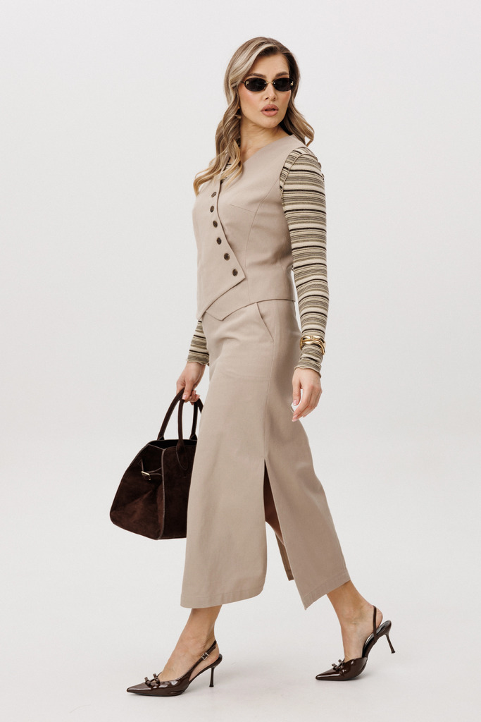 Костюм с жилетом - прекрасное решение для смелых экспериментов. Выполненный в нейтральной цветовой гамме, он позволяет дополнять себя различными аксессуарами и создавать каждый раз новые актуальные об... Показать описаниеразы.Жилет полуприлегающего силуэта с центральной застёжкой и фигурным бортом. Полочка с боковым рельефом и нагрудной вытачкой. Спинка с центральным швом, боковым рельефом и талиевой вытачкой.Юбка А-образного силуэта с центральным швом с высоким разрезом по переднему полотнищу. Заднее полотнище с центральным швом, вытачками и застёжкой на тесьму-молнию. Пояс притачной с частично эластичными вставками. По боковым швам - наклонный карман.Длина юбки около 87 см, длина жилета около 52 см. вискоза 72%, ПЭ 25%, спандекс 3%.