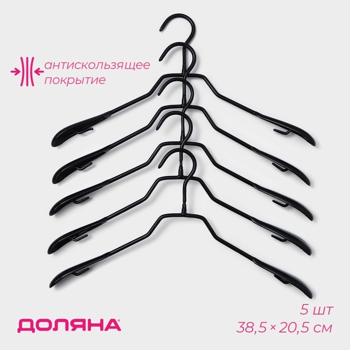 Плечики - вешалки для одежды Доляна, 38.5?20.5 см, 5 шт., антискользящее покрытие, чёрныеВопросы по товару