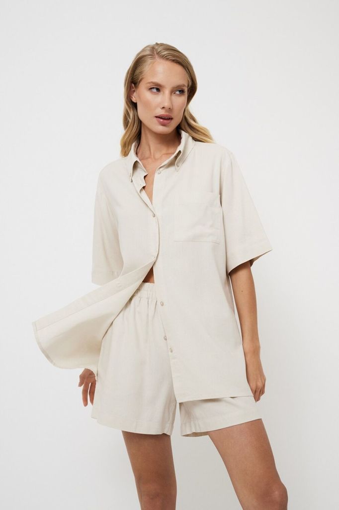 Состав: Вискоза-70%; Лён-30%; Страна бренда: Польша Состав: Вискоза-70%; Лён-30%; Представляем вам женский комплект Katarina — гармоничное сочетание комфорта и стиля. Изготовлен из вискозно-льняной см... Показать описаниееси в спокойном однотонном светло-бежевом цвете. Рубашка на пуговицах с короткими рукавами, украшена нагрудным карманом, обладает лёгким игривым шармом. Широкие шорты с высокой талией и практичными карманами. Пояс на эластичной резинке. Этот комплект излучает очарование. Погрузитесь в атмосферу отдыха и стиля с комплектом Katarina, в котором комфорт и неподвластная времени элегантность идеально сочетаются.