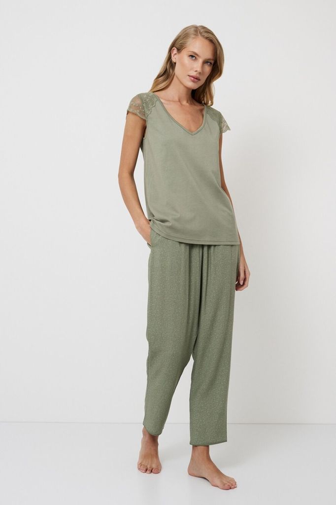 Состав: Вискоза-100%; Страна бренда: Польша Состав: Вискоза-100%; Представляем вашему вниманию нашу очаровательную пижаму Odelia, в которой каждая деталь — восхитительный сюрприз, ожидающий своего отк... Показать описаниерытия. Топ, сшитый из роскошной хлопково-модалной смеси в успокаивающем оливковом цвете. V-образный вырез и кружевные короткие рукава придают ему женственное очарование. Брюки длиной до щиколотки, сшитые из мягкой вискозы, дополнены регулируемым поясом-бантом и зелёной окантовкой. Они украшены очаровательным приглушённым абстрактным узором, который дополняет кружевные детали топа. Погрузитесь в очарование пижамы Odelia и испытайте новые ощущения от домашней одежды. Состав: футболка 50% хлопок, 50% модал; шорты 100% вискоза.