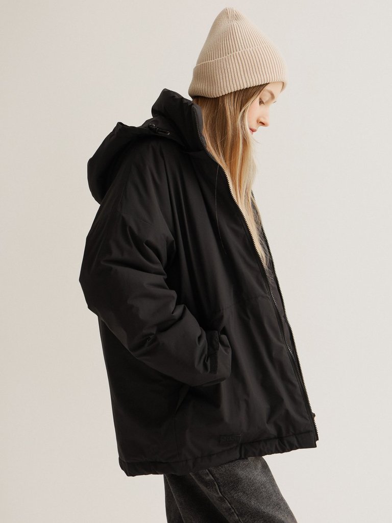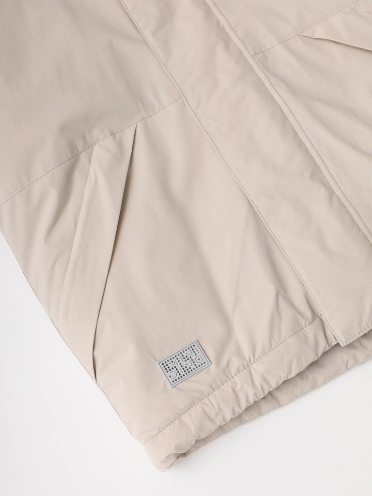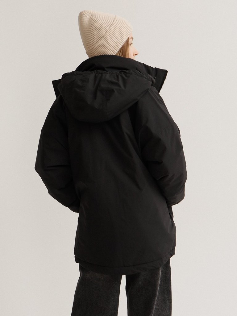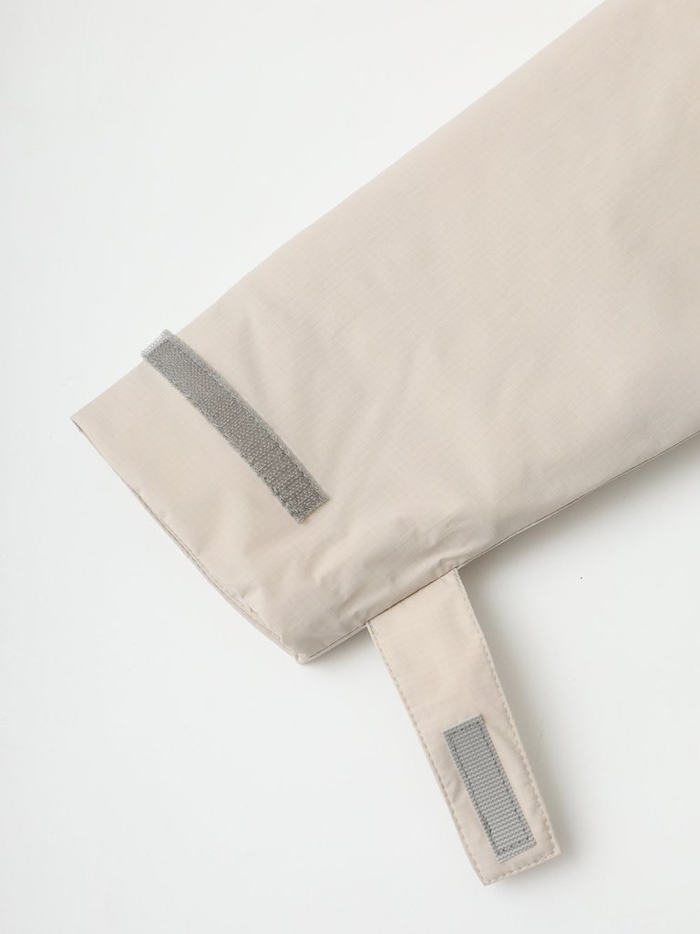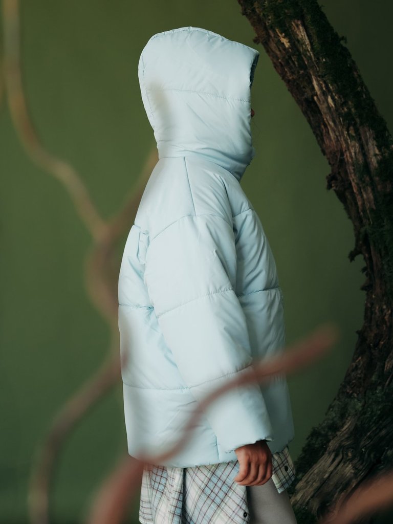 Куртка с объемными рукавами и воротником-стойкой. Регулируемая утяжка по низу изделия для лучшей защиты от поддувания, два кармана спереди.
