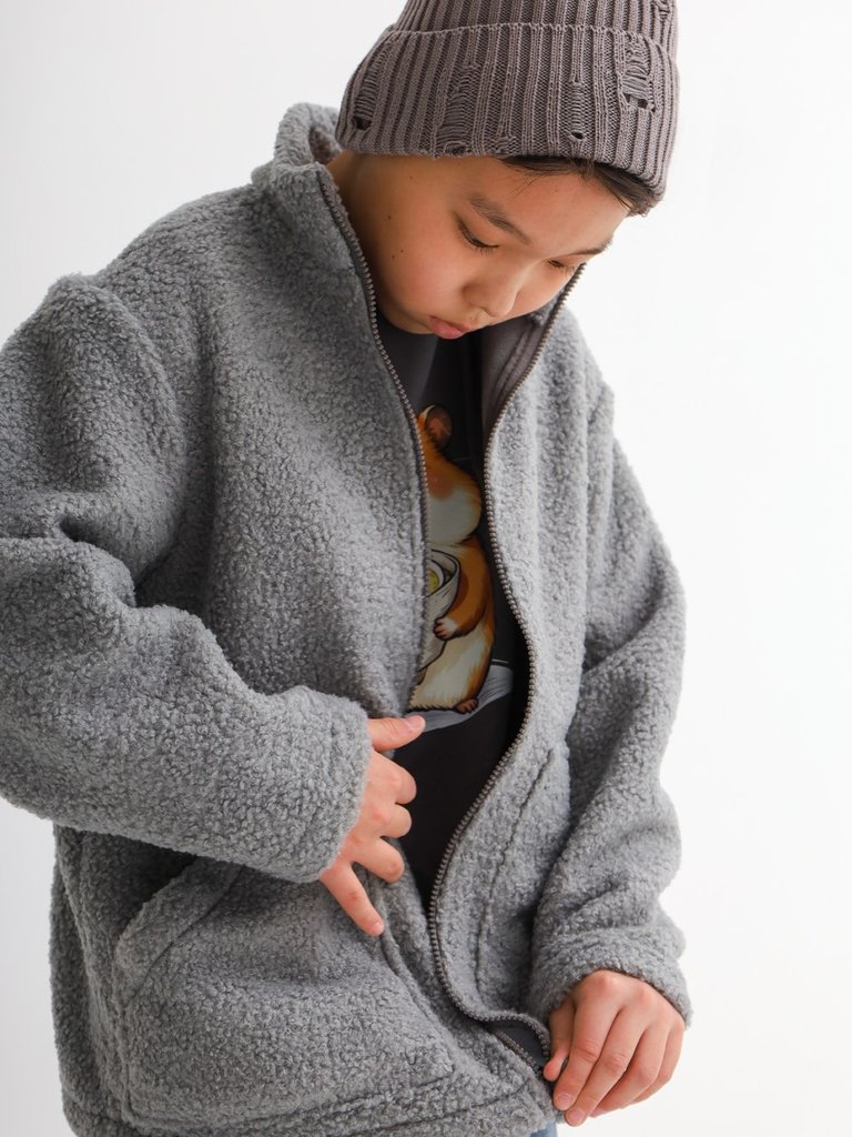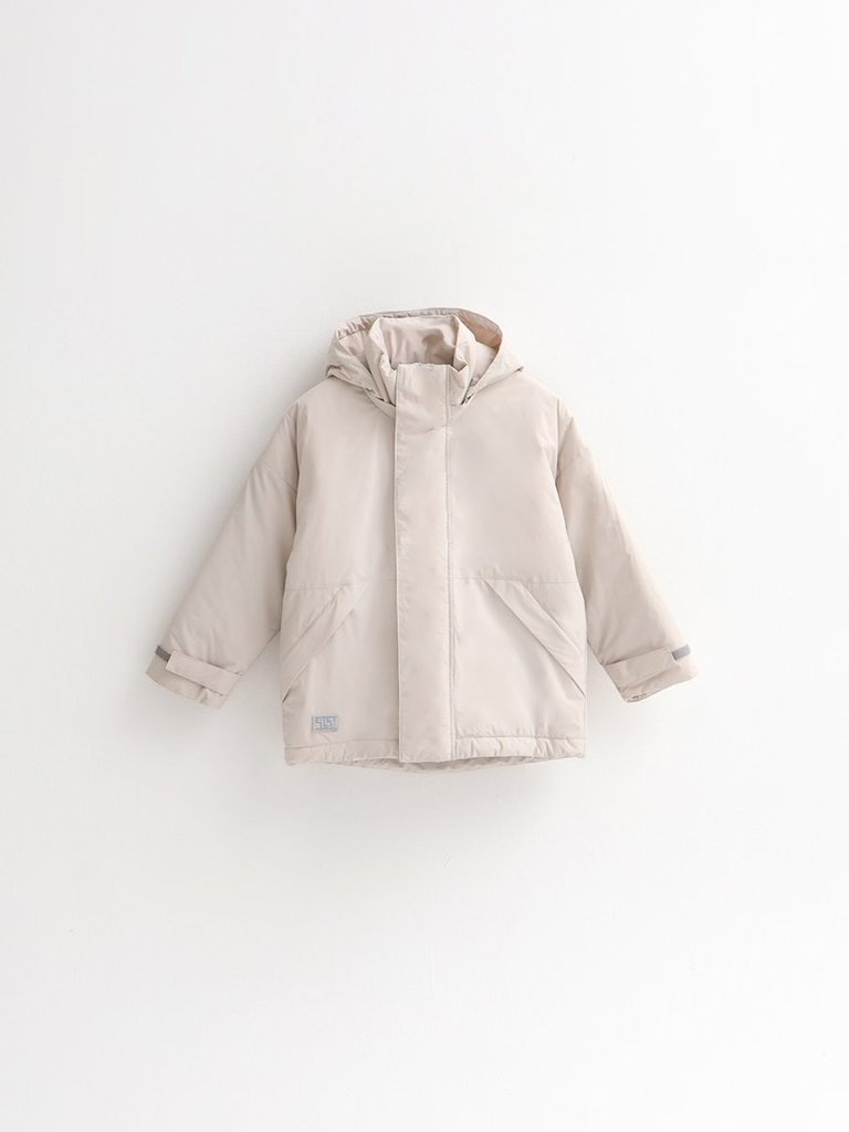 Куртка с объемными рукавами и воротником-стойкой. Регулируемая утяжка по низу изделия для лучшей защиты от задувания ветра, два кармана спереди.