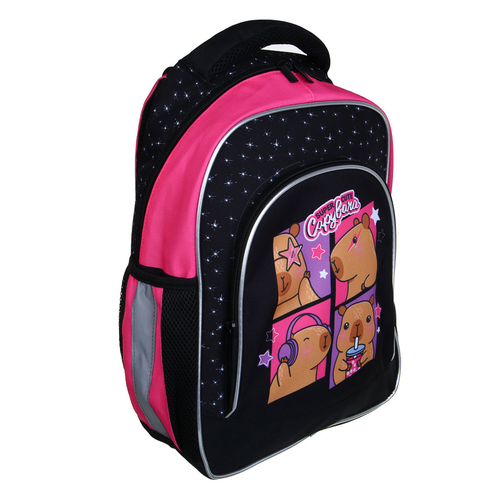 Рюкзак школьный FLOMIK Капибара 39х30х22 см – идеальное сочетание стильного дизайна и продуманной функциональности для учеников начальных классов. Яркий принт с добродушной капибарой делает его настоя... Показать описаниещим фаворитом среди детей, а родители оценят его удобство и практичность. Рюкзак выполнен из прочного полиэстера, который не боится ежедневных нагрузок, легко чистится и сохраняет форму. Вместительное основное отделение с эластичным фиксатором надежно удерживает учебники формата А4+ и тетради, а передний карман на молнии и мини-органайзер помогут организовать мелкие принадлежности. Два сетчатых боковых кармана удобны для бутылки с водой или зонтика. Эргономичная спинка с мягкими подушечками равномерно распределяет нагрузку, а регулируемые широкие лямки не давят на плечи. Дополнительная ручка позволяет носить рюкзак в руках, а светоотражающие элементы обеспечивают безопасность в темное время суток. При весе всего 520 г он не утяжеляет спину, но вмещает все необходимое для школы.
