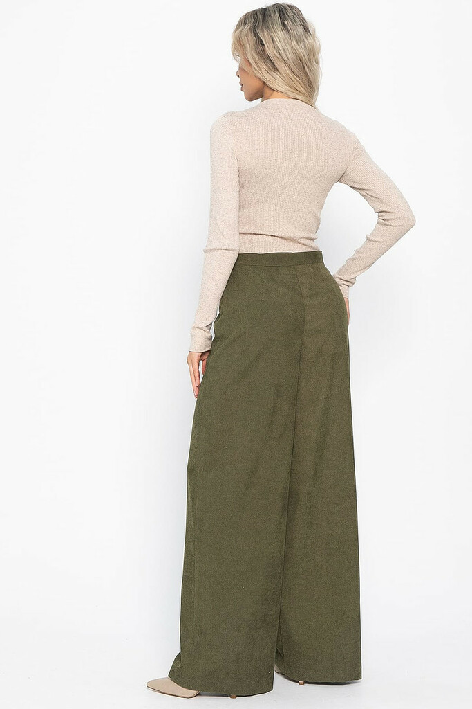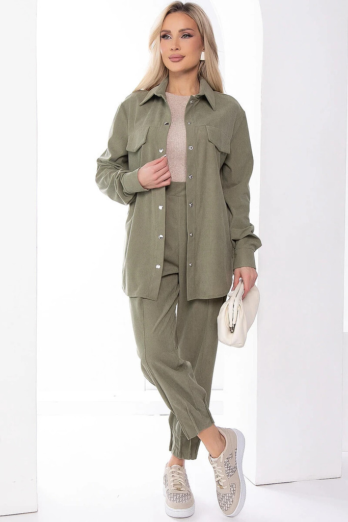 Ткань: микровельвет. Состав: 65% п/э, 30% вискоза, 5% эластан. Цвет: хаки. Карманы: в боковых швах брюк. Длина готового изделия брюки с учетом резинки: 44/ 93 см, 46/ 93 см, 48/ 93 см, 50/ 94 см, 52/ ... Показать описание94 см, 54/ 94 см. Рост модели: 168 см. Брюки с высокой посадкой, талия на широкой резинке. В боковых швах есть карманы. Такой костюм идеален для создания повседневного образа современной девушки. По низу брюки декорированы защипами. Уход за изделием: ручная стирка до 30 градусов; нельзя отбеливать; деликатный отжим; гладить при t не более 110 С; гладить с изнанки. *Допуск отклонения длины при массовом производстве 1-3 см является нормой.