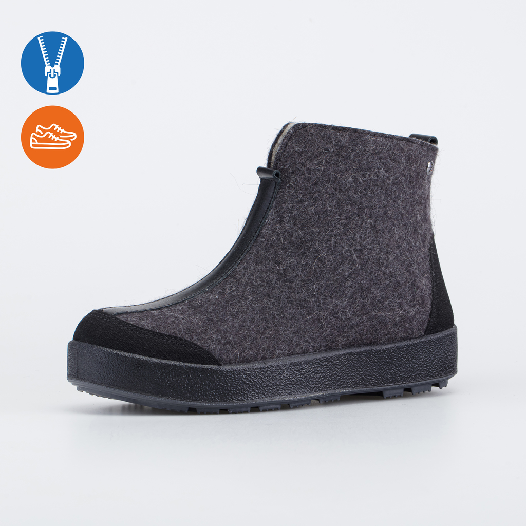 Описание Описание модели Короткие валенки, выполненные в стиле войлочных мужских полусапожек, дарят ногам уют натурального войлока и при этом отлично сочетаются с современными образами. Войлок плотный... Показать описание, с водоотталкивающими свойствами. Он надежно сохраняет тепло, дышит и создаёт приятный микроклимат вокруг стопы. Носок и пятка защищены кожаными накладками с ПУ-покрытием. Спокойный темно-серый цвет делает модель подходящей для разных случаев и стилей. Эти теплые валенки имеют подкладку из шерстяного меха и войлочную стельку. Она снабжена петелькой, чтобы легко вынимать ее для проветривания. Валенки на молнии обладают хорошей раскрываемостью, их удобно обувать и снимать. Кедовая подошва из полиуретана сохраняет зимнюю обувь легкой, а резиновая накладка на ходовой поверхности обеспечивает устойчивость на зимних покрытиях. Модель анатомически правильная: обеспечивает комфортную поддержку стоп в течение всего дня. Сделано в России, ТМ Гуслицкие.