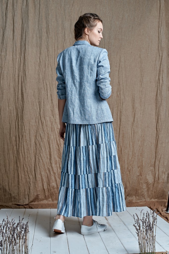 Цвет: голубой Описание Состав: 100% льняная ткань. Плотность ткани 190 г/м_. Жакет женский полуприлегающего силуэта, среднего объёма. Прилегание образуется за счёт рельефов  по спинке и вытачек п... Показать описаниео полочке. Рукав втачной двухшовный. Воротник «английский» пиджачного типа. Застёжка центральная на одну пуговицу. Карманы прорезные с втачной листочкой. Модель разработана на рост 164-170 см. Параметры модели: рост – 172 см, ОГ – 84 см, ОТ – 60 см, ОБ – 90 см. На модели 42 размер.