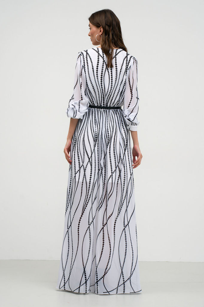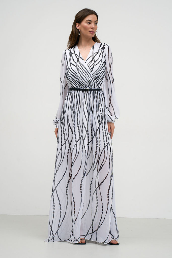 Состав: ПЭ-100%; Шифоновое платье длиной maxi с неповторимым дизайнерским принтом сделает Ваш образ незабываемым и ярким. Горловина V-образной формы, рукав длинный, втачной с манжетой. Платье отрезное... Показать описание по линии талии, на эластичной тесьме. Изделие на подкладке. Возможно отличие фотографии по оттенку, связанное с разной цветопередачей монитора. Замеры 44-50: Длина по центру спинки (см): 118, 118, 118, 118 По груди (см): 48, 50, 52, 54 По бедрам (см): 54, 56, 58, 60 По талии (см): 41, 43, 45, 47 Длина рукава (см): 64, 64, 64, 64 Ширина рукава (см): 21.1, 21.8, 22.5, 23.2 Размер воротника (см): 21.5, 22, 22.5, 23 Ширина плеча (см): 9.4, 9.6, 9.8, 10 Ширина спинки (см): 33, 34, 35, 36