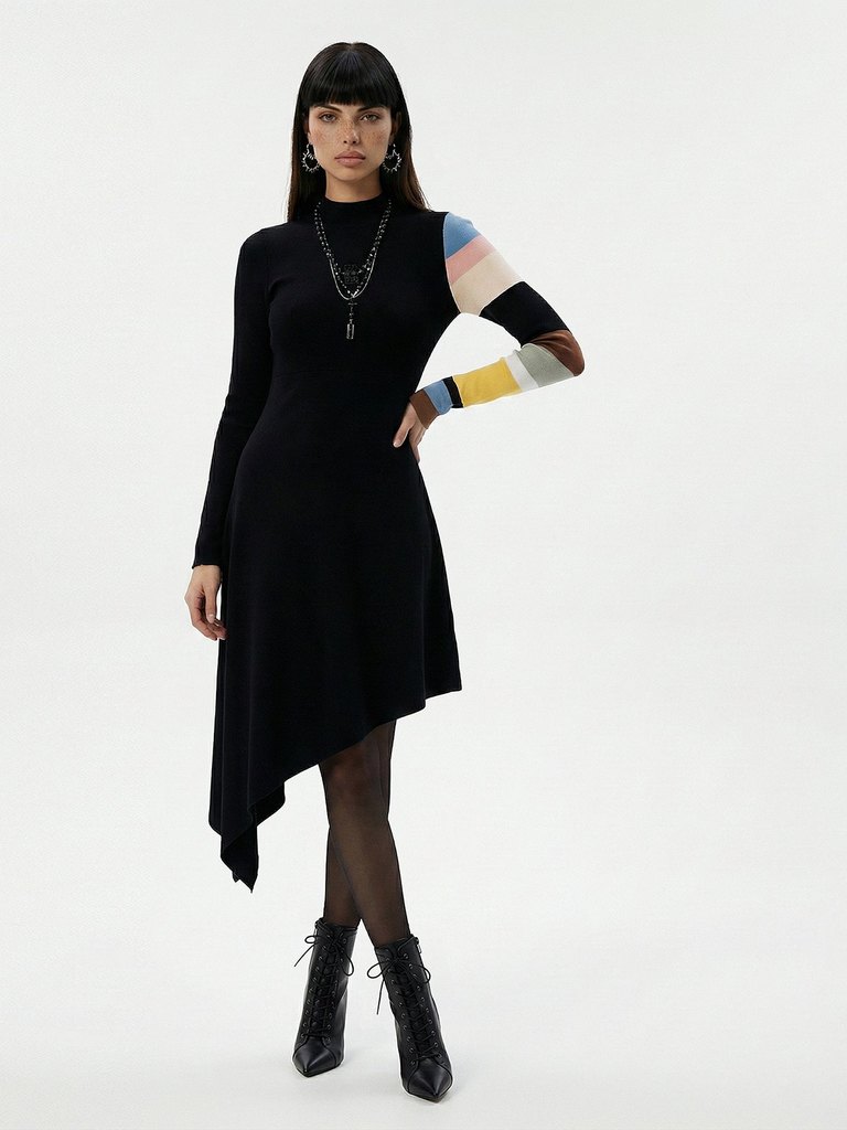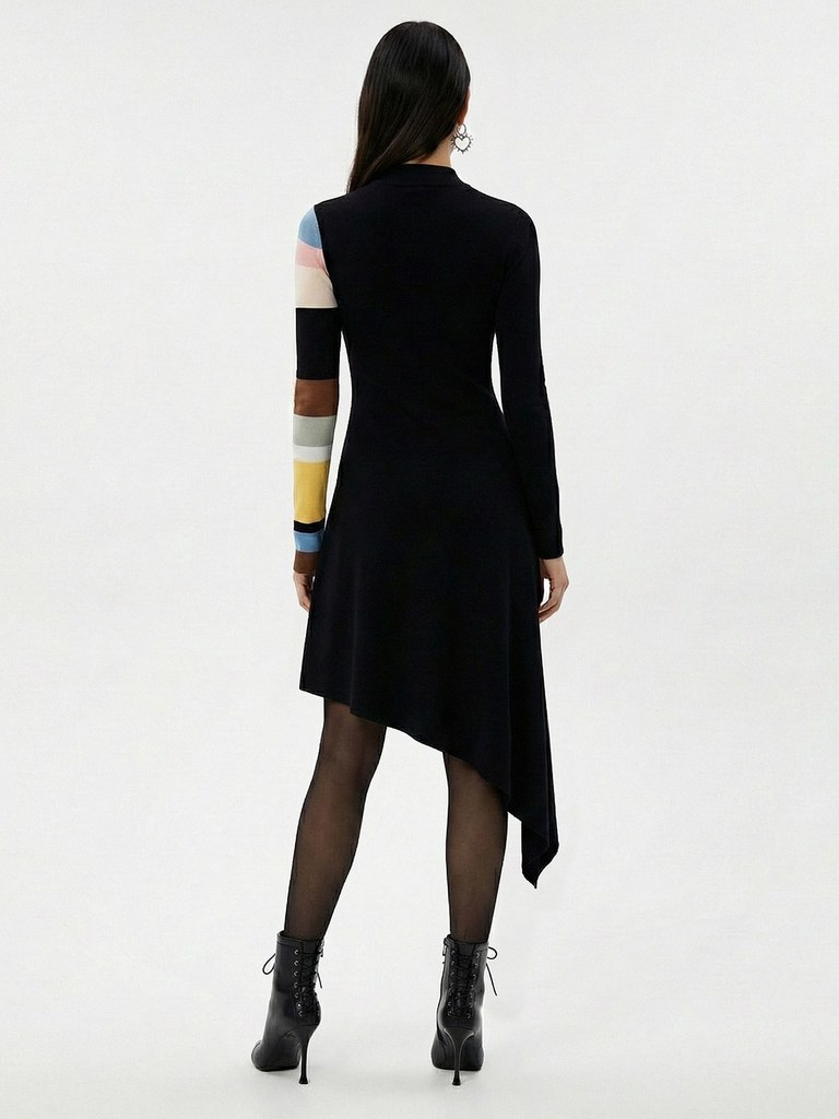 Состав: 72% вискоза, 28% pbt. Длина по спинке: 93 см. Цвет: черный. Асимметричное вязанное платье из вискозы А-образного силуэта без прилегания по талии. Длина изделия по короткой части до середины бе ... Показать описаниедра. Юбка сложной формы асимметричная. Завышенная линия талии. Рукав втачной прямого покроя прилегающий удлинённый с разрезом и небольшим расклешением по низу. Вырез горловины круглый с невысоким воротником "стойка" свободно лежащей по шее, без сильного прилегания. В разложеном виде длина по спинке до уровня короткой части юбки 75 см, по длинной - 109 см. В надетом виде длина может немного увеличиваться. Подробное описание: https://happychoice.ru/catalog/platya/2491_plate_zhenskoe_tsvet_chyernyy/