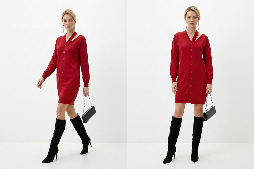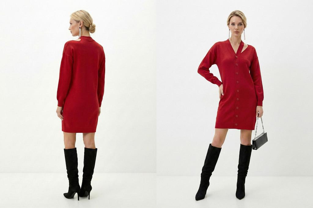 Состав: 52% вискоза, 22% полиамид, 26% РВТ. Длина по спинке: 95 см. Цвет: красный. Вязаное платье прямого силуэта длиной чуть ниже середины бедра. Линия плеча спущенная, рукав рубашечного кроя стачной ... Показать описание в щелевидную пройму. Вырез горловины V-образный. Застёжка центральная на петли и пуговицы. Подробное описание: https://happychoice.ru/catalog/platya/2429_plate_zhenskoe_tsvet_krasnyy/
