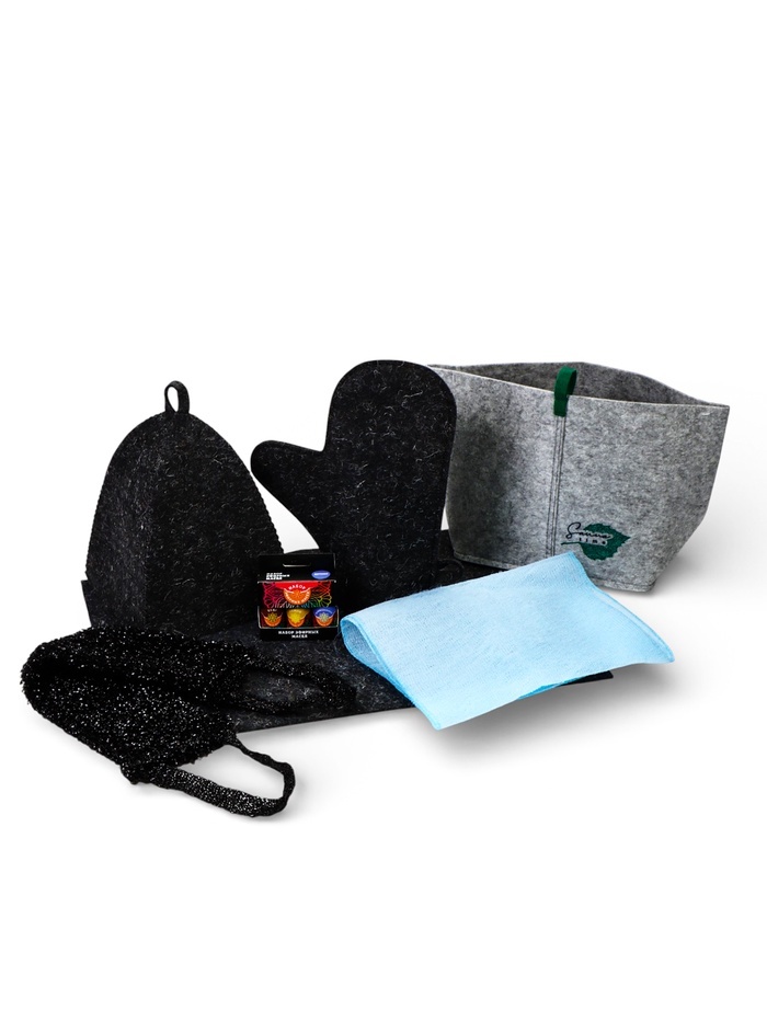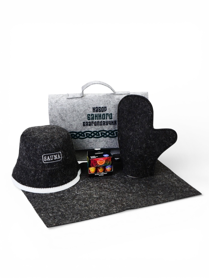 Банный комплект «Набор банного благополучия» — готовый набор аксессуаров для бани и сауны. Внутри — шапка, рукавица, коврик и эфирные масла, упакованные в портфель для хранения и переноски. Подходит д... Показать описаниеля регулярных посещений бани и домашней сауны. * Шапка для бани: защищает голову в условиях высокой температуры, поддерживает комфорт во время парения. * Коврик для полка: создаёт личную зону в парной, делает отдых в сауне более аккуратным и гигиеничным. * Рукавица: используется при банных процедурах и контакте с горячими поверхностями. * Эфирные масла: дополняют атмосферу парной ароматом, подходят для традиционных банных ритуалов. * Портфель для хранения: помогает держать аксессуары для бани в порядке и брать комплект с собой. Набор для бани и сауны из 5 предметов выбирают те, кто ищет практичное решение без подбора принадлежностей по отдельности. Банные аксессуары в едином формате подходят для личного использования и в подарок.