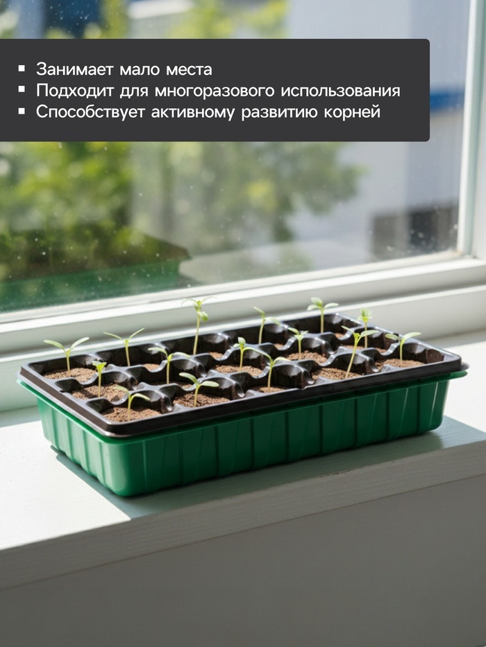 [Минипарник122]Набор для рассады с торфяными таблетками 24 шт. — компактная система для проращивания семян и выращивания молодых растений. Все компоненты подобраны для совместного использования. * 24 ... Показать описаниеторфяные таблетки диаметром 4.1 см: подходят для культур с небольшими семенами. При увлажнении увеличиваются в объёме, сохраняя форму. * Кассета на 24 ячейки по 50 мл: каждая ячейка соответствует размеру торфяной таблетки. Объёма достаточно для начального этапа развития растений. * Пластиковый поддон: собирает излишки воды при поливе и сохраняет чистоту на поверхности. Поддон обеспечивает устойчивость кассеты. Для экономного размещения: набор подходит для садоводов с ограниченным пространством для рассады. Компактные размеры ячеек и таблеток позволяют разместить много растений на маленькой площади. Решение оптимально для тех, кто выращивает большое количество рассады на начальном этапе. Применение Конструкция парника не предусматривает герметичную фиксацию крышки на основании. Она просто кладётся сверху и никак не крепится. Это нужно для того, чтобы сохранялся приток кислорода к рассаде. После использования сохраните изделие до следующего сезона.