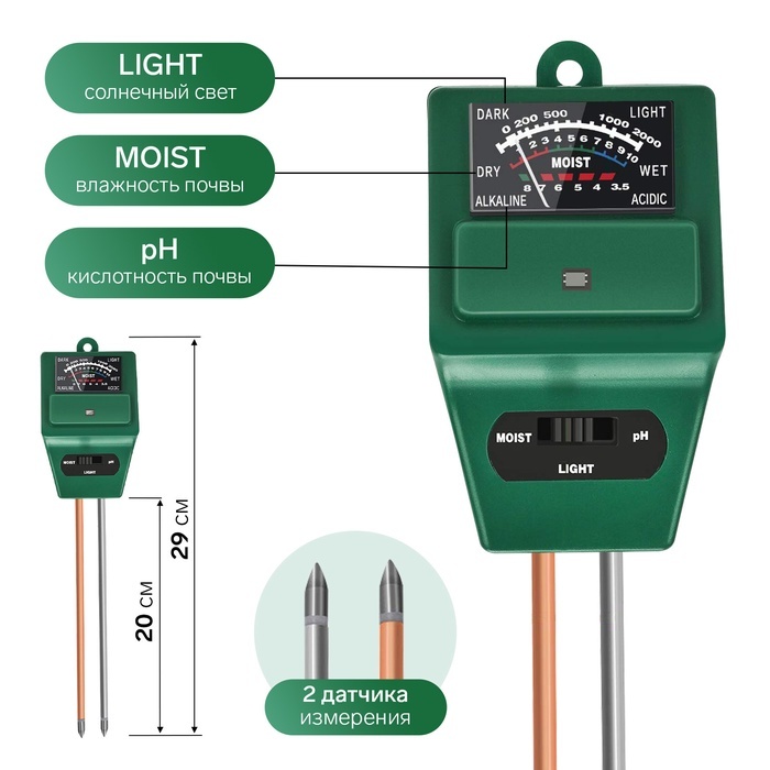 [opisanye1122][opisanye1122]Прибор для измерения влажности и pH (кислотности) почвы предназначен для быстрого и удобного контроля состояния грунта. Он помогает определить уровень влажности и кислотнос... Показать описаниети без использования батареек, что делает его простым и надёжным инструментом для ухода за растениями в доме, теплице или саду. Применение Используется для оценки состояния почвы перед поливом и подбором оптимальных условий выращивания растений, овощей, цветов и рассады. Комплектация * Комплектация: прибор для измерения влажности и pH почвы, упаковка Дополнительно * Тип измерений: влажность почвы, pH (кислотность) * Принцип работы: механический * Питание: не требуется * Материал: пластик, металл * Цвет: зелёный