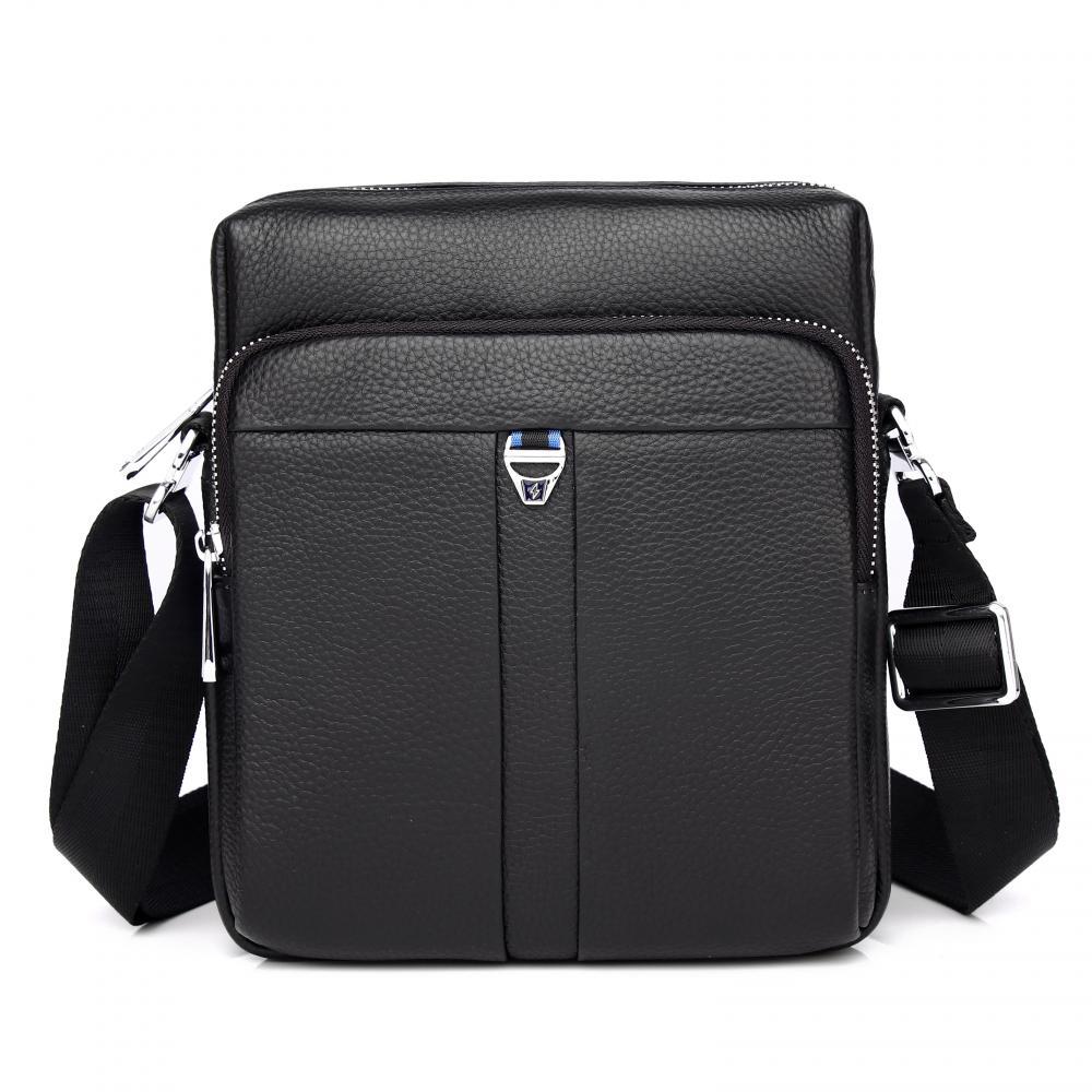 Классическая мужская сумка на плечо MIRONPAN выполнена из натуральной зернистой кожи в черном цвете. Основное отделение закрывается на полукруглую молнию с кожаным поводком. Внутри есть 2 боковых карм... Показать описаниеана для мелочей: открытый и на молнии. На лицевой стороне расположены 2 вместительных кармана на молнии и на кнопку , на тыльной стороне также предусмотрен карман быстрого доступа. Плечевой ремень регулируется по длине, ширина - 4 см. Цвет фурнитуры - серебро. Вес 450 Размер 17 х 20 х 7 (длина х высота х ширина)