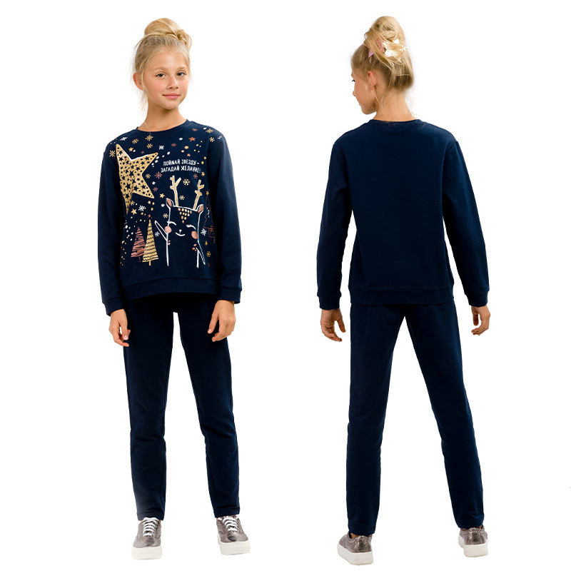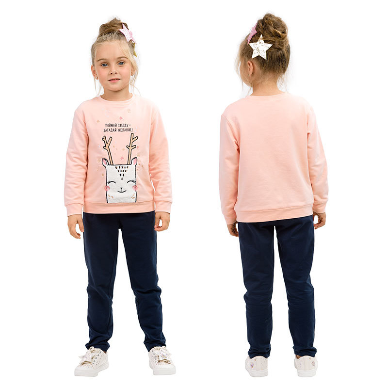 Состав: верх: 96%хлопок 4%эластан, низ: 96%хлопок 4%эластанОписание: Комплект для девочек: толстовка и брюки. Комплект из футера. Толстовка среднего объёма, со спущенным плечом. На передней части изде... Показать описаниелия пушистая аппликация в виде оленя, с обратной стороны которой водорастворимая пленка, и надпись "Поймай звезду - загадай желание!". Манжеты из основной ткани на рукавах и по низу изделия. Брюки слегка заужены к низу, регулировка объема по талии шнурком.